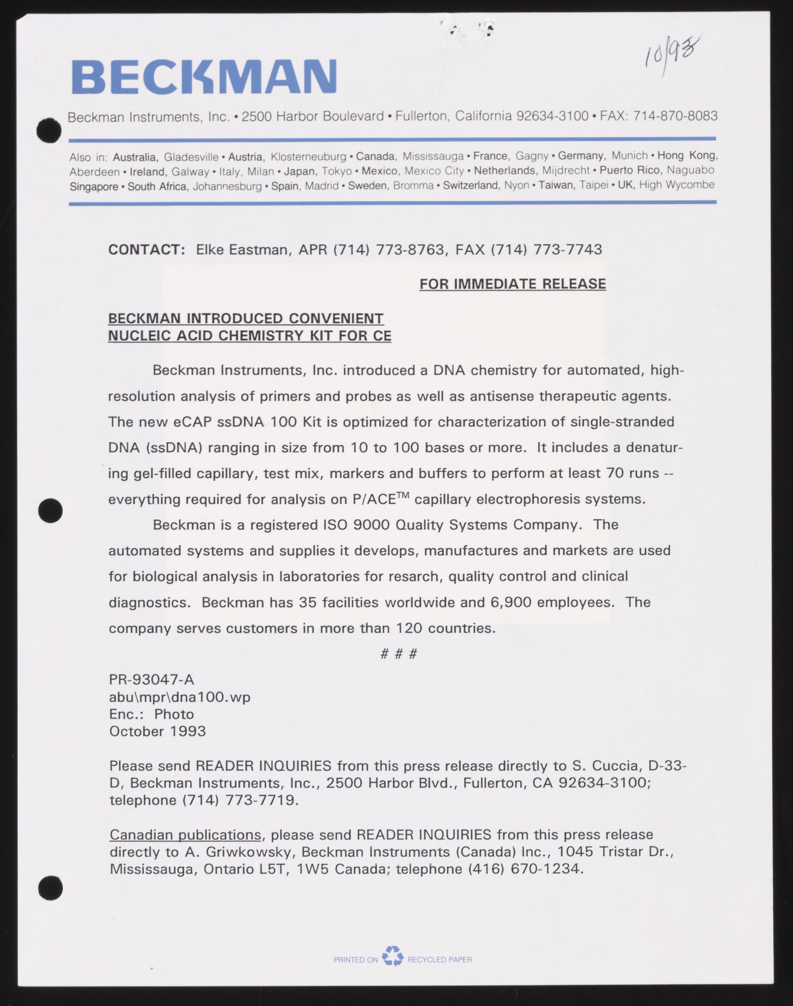 Eastman, Elke. “Beckman Introduced Convenient Nucleic Acid Chemistry Kit for CE,” October 1993. Beckman Historical Collection, Box 58, Folder 73. Science History Institute. Philadelphia. https://digital.sciencehistory.org/works/79407x690.