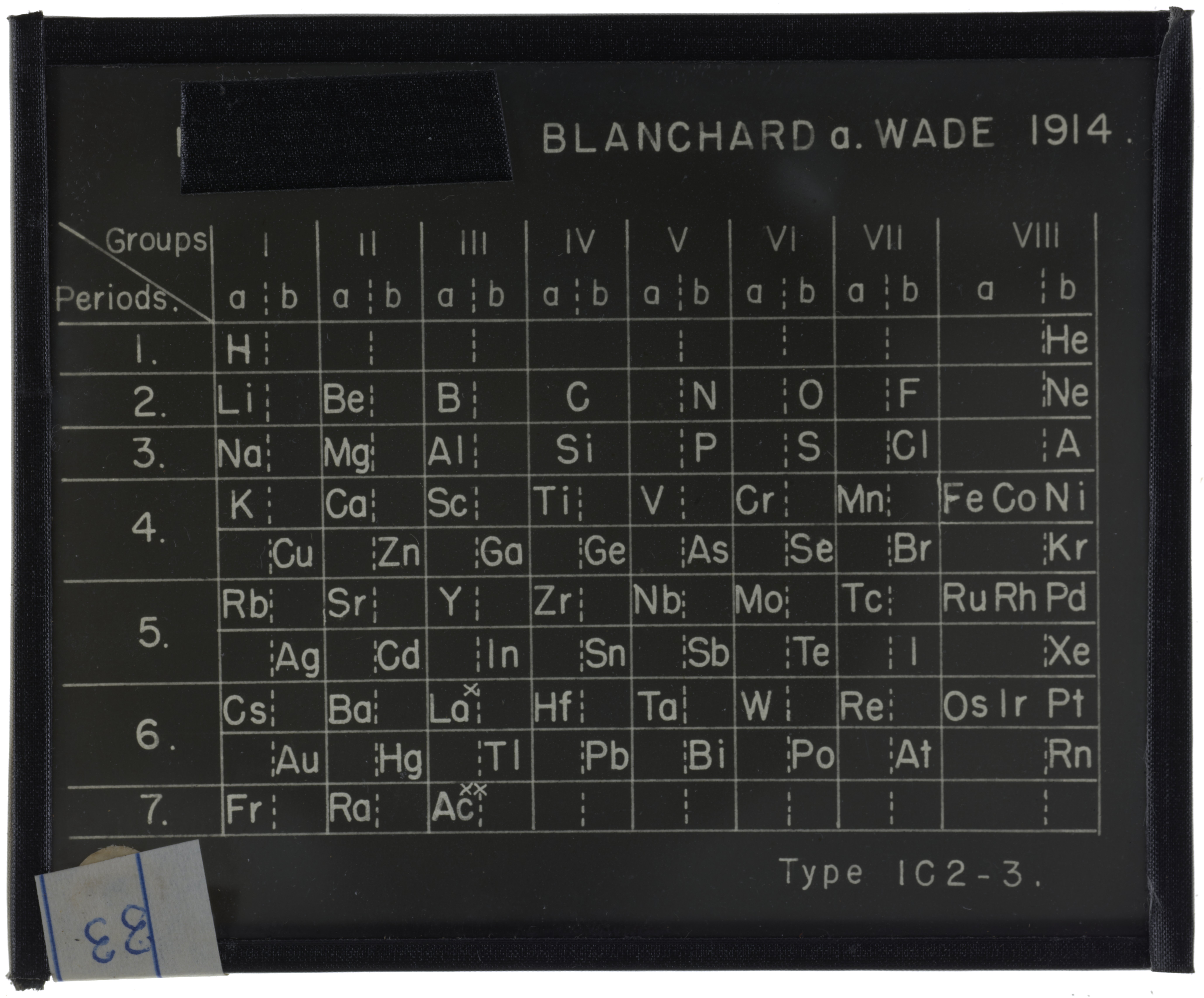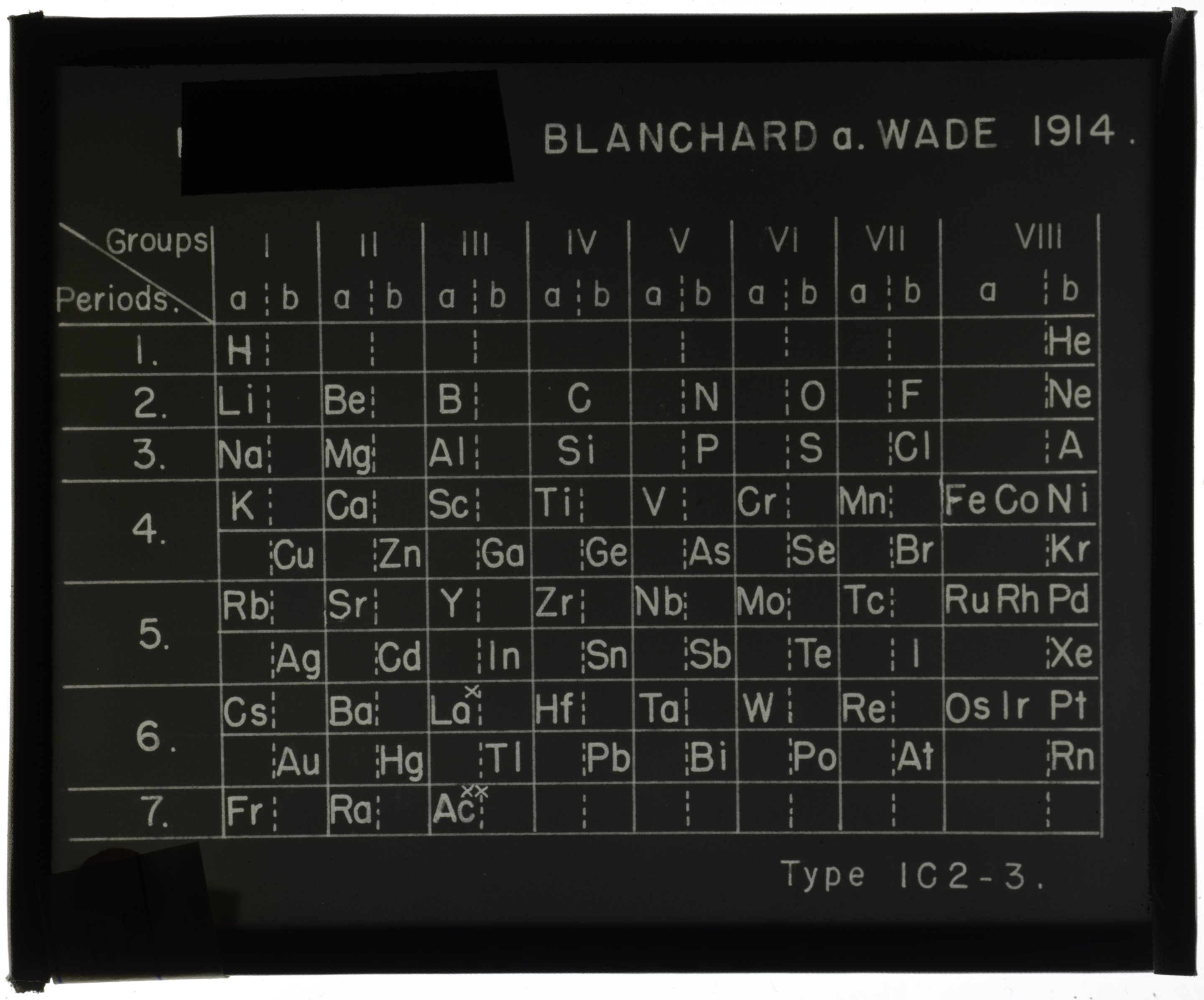 Blanchard, Arthur A. (Arthur Alphonzo), Frank Bertram Wade, and Edward G. Mazurs. “Series Table with Symmetrically Divided Short Periods.” Glass (material), circa 1914–1957. Edward G. Mazurs Collection of Periodic Systems Images, Box 1. Science History Institute. Philadelphia. https://digital.sciencehistory.org/works/79407x754.