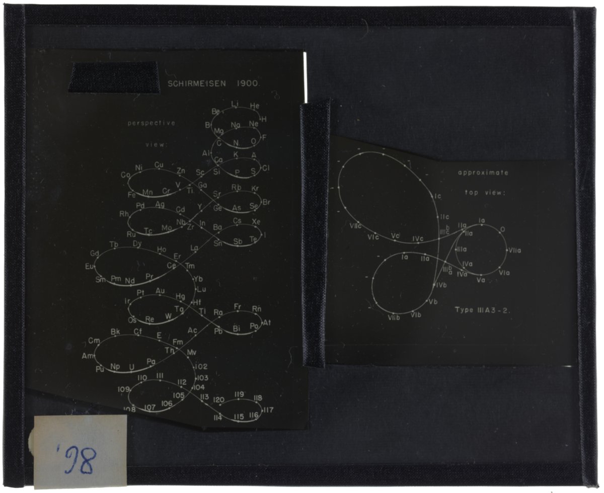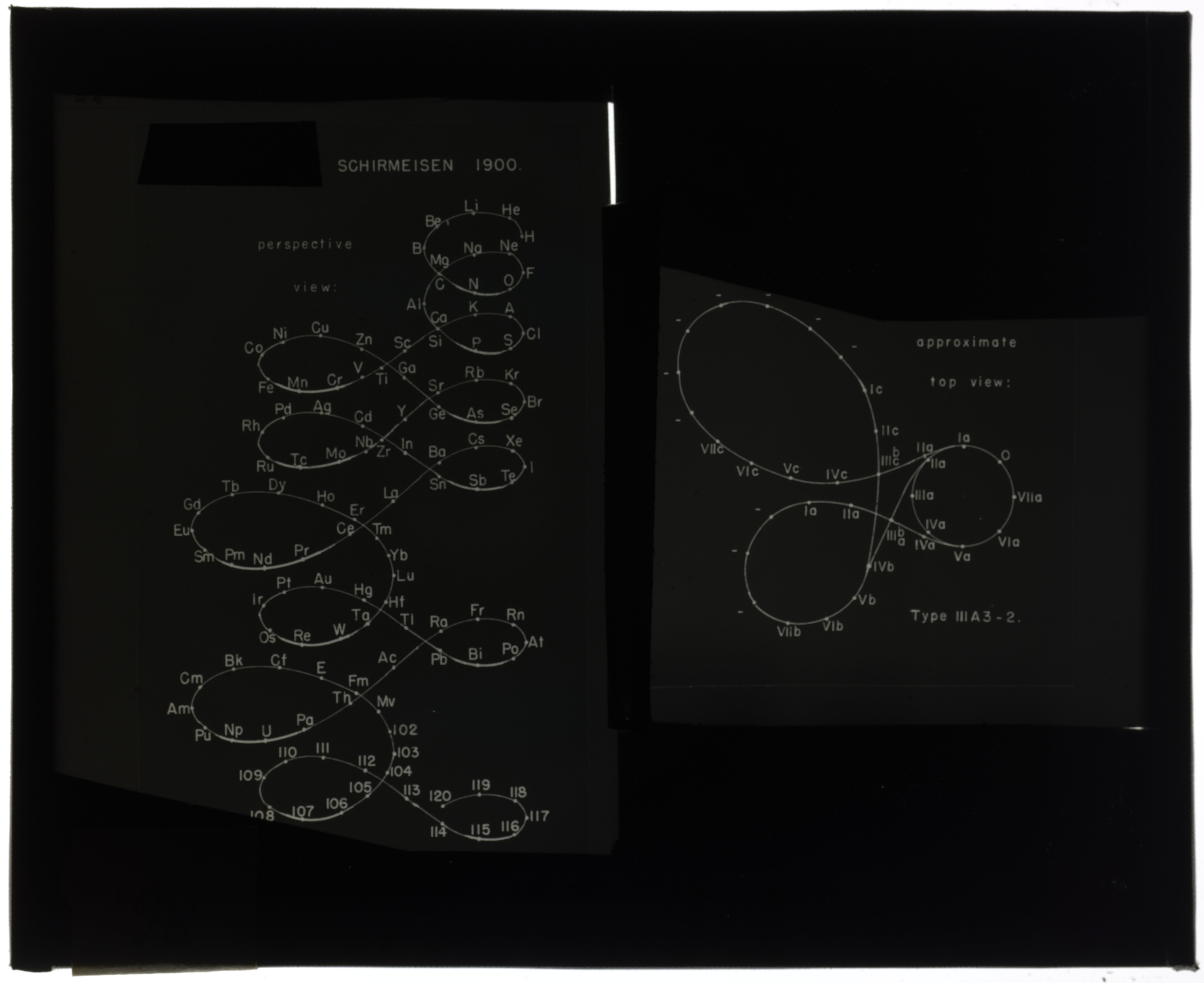 Schirmeisen, Karl, and Edward G. Mazurs. “Periodic Table in Style of Helix and Space Lemniscate with Additional Loop for Rare Earth Elements.” Glass (material), circa 1900–1957. Edward G. Mazurs Collection of Periodic Systems Images, Box 1. Science History Institute. Philadelphia. https://digital.sciencehistory.org/works/79407x76d.
