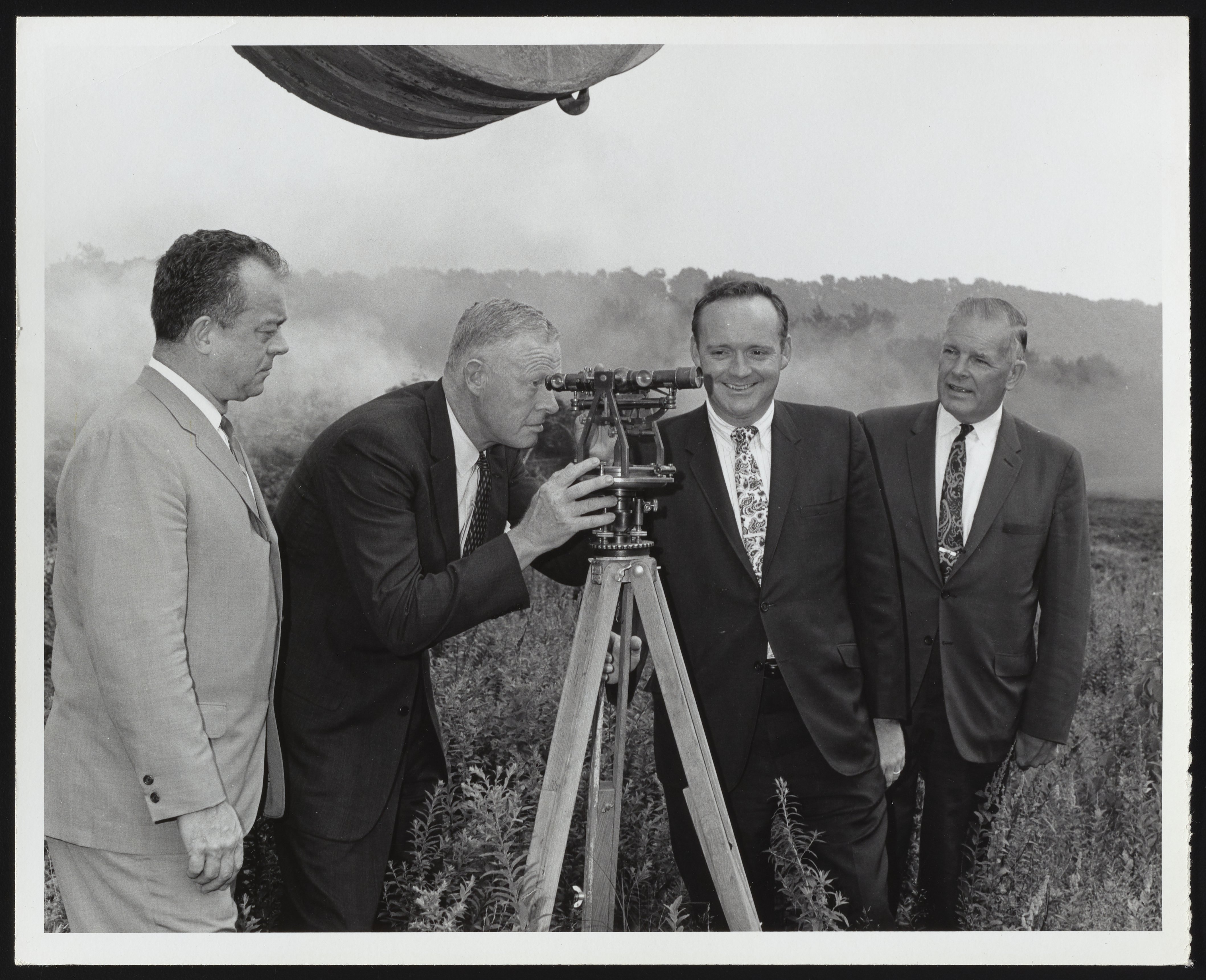 General view of Perkin-Elmer Corporation President Chester W. Nimitz, Jr. looking through an optical device at the groundbreaking ceremony for a new company facility in Meriden, Connecticut. The other individuals present in the photograph are identified as follows (left to right): Carter H. White (Vice President, Meriden Industrial Development Commission); Meriden Mayor William T. Shea; and George D. Huff (Perkin-Elmer official).