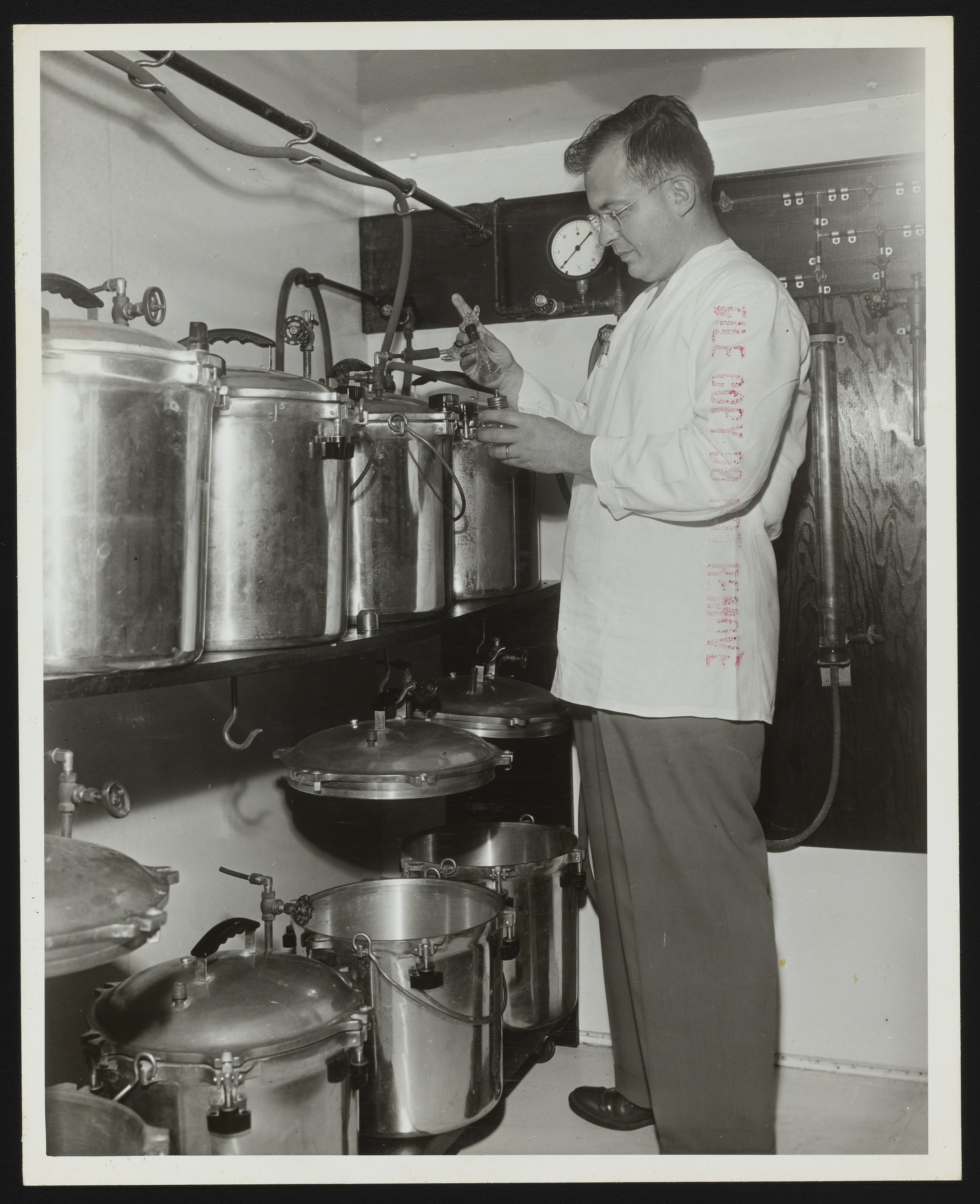 General view of chemist Mark Wolf preparing a sample for analysis at the Dow Chemical Company's Agricultural Chemical Research and Development Laboratory facilities. Per an article in the August 1941 edition of the Dow Diamond, the department was responsible for studying the diseases of living plants, the effects of parasites, and the study and testing of insecticides, fungicides, and fumigants. As part of that research, chemists like Wolf were responsible for the small-scale compounding of insecticidal or fungicidal sprays or dusts, which were subsequently field-tested for uniform and effective distribution on foliage using standard equipment.