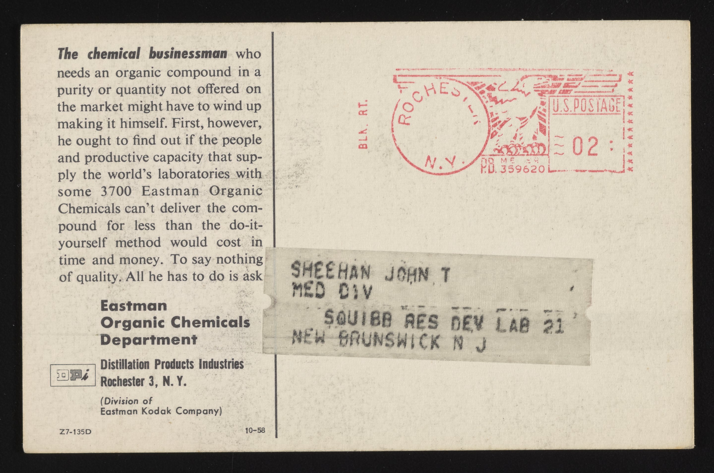 Front and back of an illustrated color postcard advertising the products and services of the Eastman Organic Chemicals Department (Division of the Eastman Kodak Company). The postcard features three women, styled as witches, stirring a bubbling cauldron while a harried-looking man works in the background. Postmarked from Rochester, New York, the postcard also includes a brief summary of Eastman’s available stock of chemical compounds as they pertain to the “chemical businessman.”