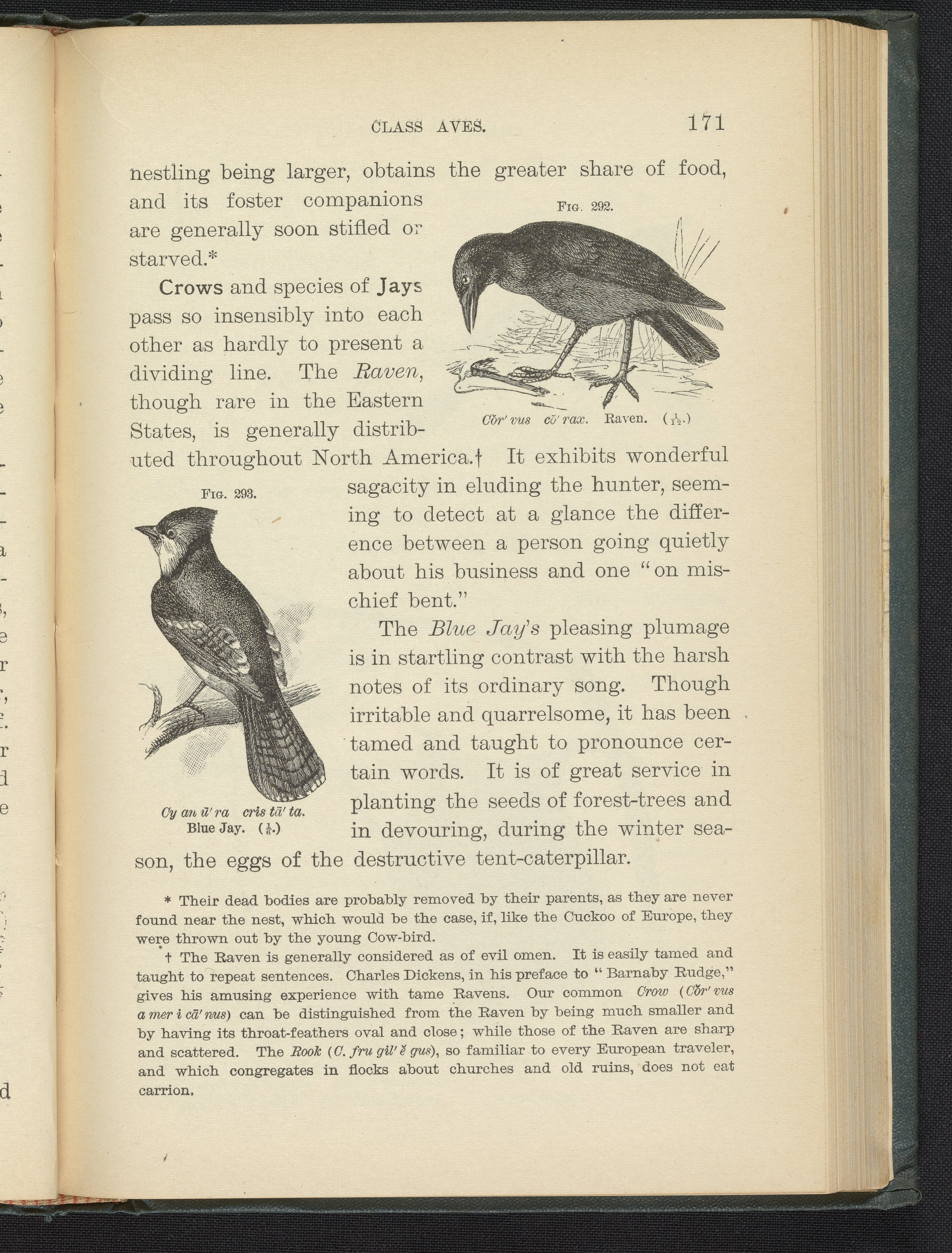 Steele, Joel Dorman, and Jenks, J. W. P. (John Whipple Potter). “Figure 292. Raven. Figure 293. Blue Jay.” Popular Zoology. New York, New York: Chautauqua Press, 1887. https://digital.sciencehistory.org/works/7cmv8r0.