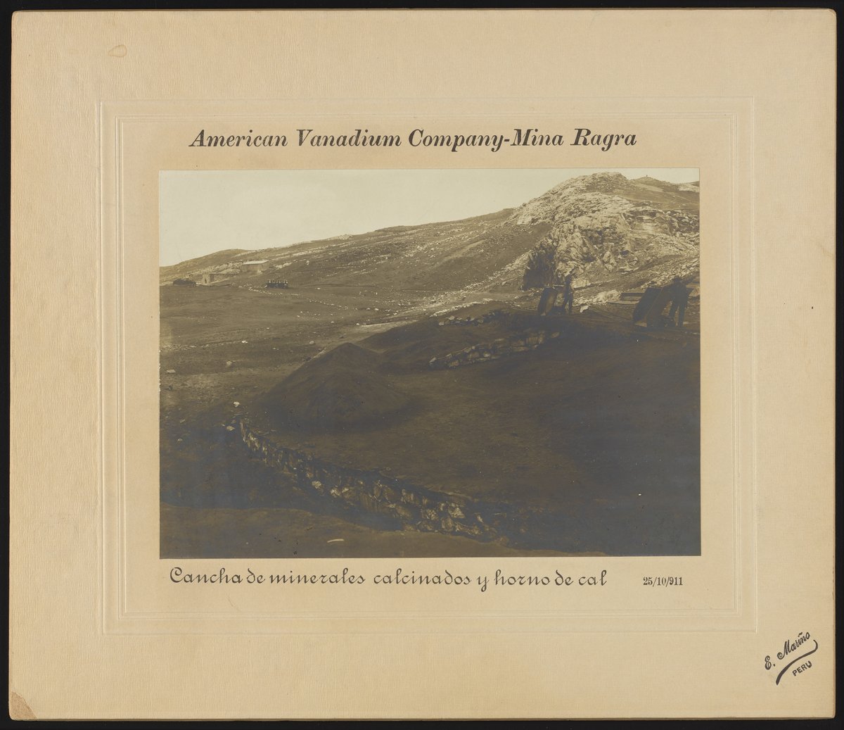 General view of a field of calcined minerals and lime kiln at the American Vanadium Company (later the Vanadium Corporation of America) mining camp located at Mina Ragra in the Peruvian Andes. Vanadium, a malleable transition metal, was discovered in its natural state in Mexico by Spanish-Mexican scientist, engineer, and naturalist Andrés Manuel del Río (1764-1849) in 1801, though it was not isolated and recognized as an element until 1830. Following the discovery of a large deposit of vanadium in the Peruvian Andes in 1905, vanadium became commercially viable and significantly impacted the steel industry. In 1906, the American Vanadium Company was organized to mine the new deposit, known as Mina Ragra, and use of vanadium to produce specialty steel alloys quickly became widespread, particularly in the burgeoning automobile industry.