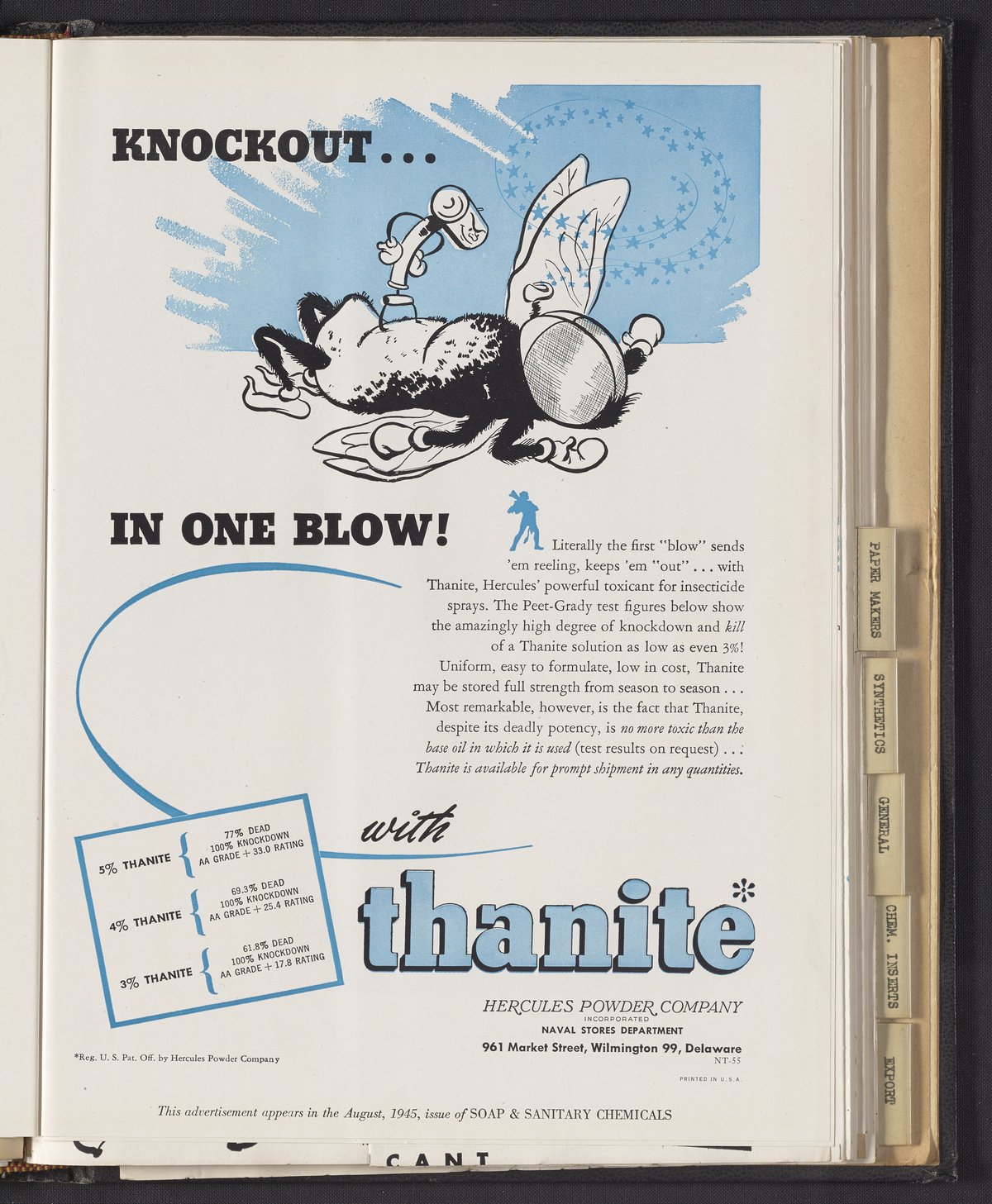 Hercules Incorporated. “Knockout...in One Blow!” 1945 Hercules Advertisements, 1945. Records of Hercules Incorporated, Volume 1945. Science History Institute. Philadelphia. https://digital.sciencehistory.org/works/7d278t90r.