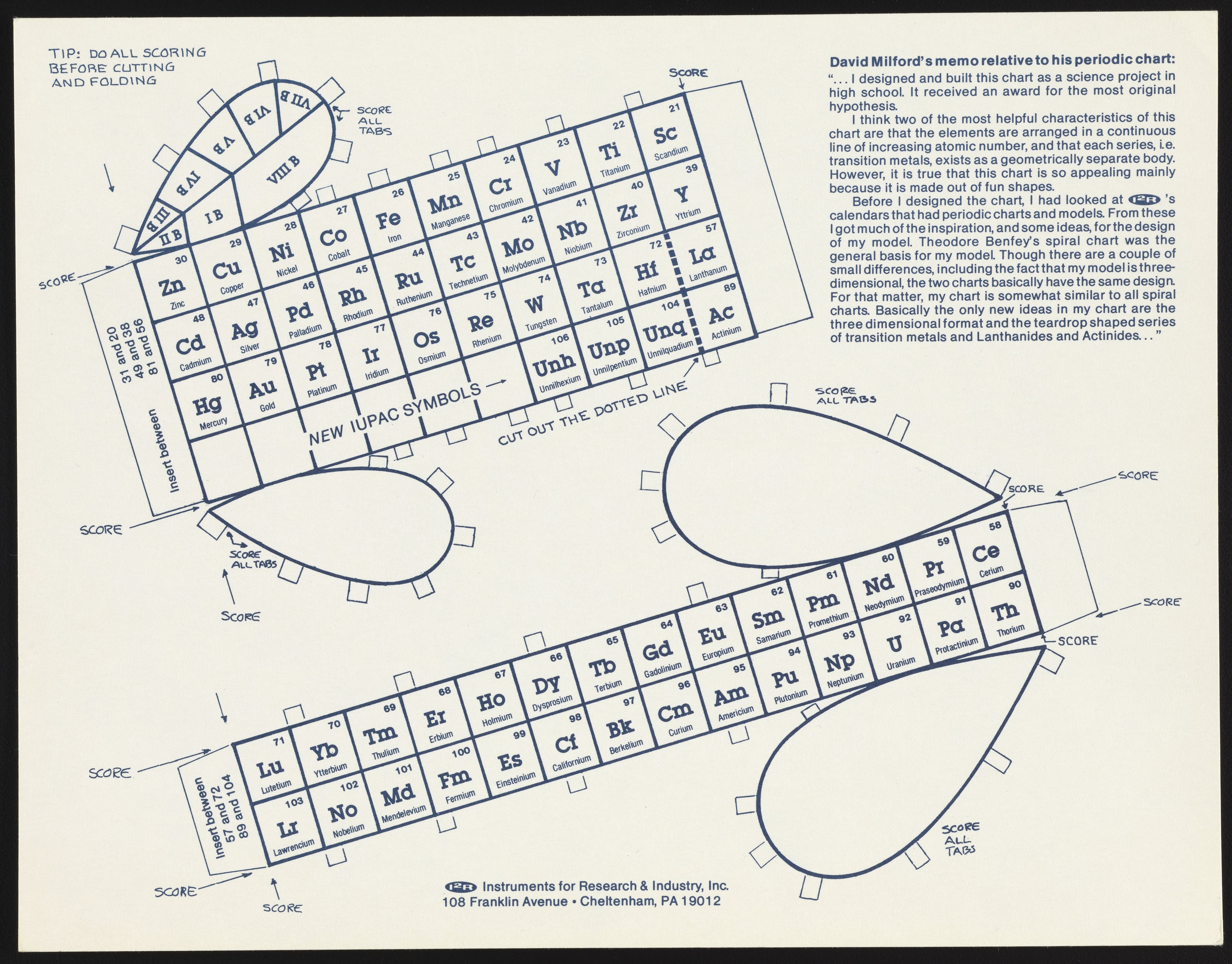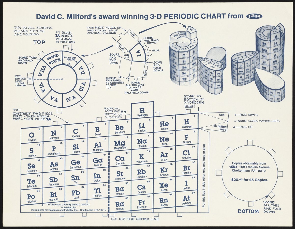 Milford, David C. “David C. Milford's Award Winning 3-D Periodic Chart from I2R.” Cheltenham (Township), Pennsylvania: Instruments for Research and Industry, n.d. Periodic Tables Collection, Box FC-5, Folder Periodic Tables (Assorted). Science History Institute. Philadelphia. https://digital.sciencehistory.org/works/7d278v04w.