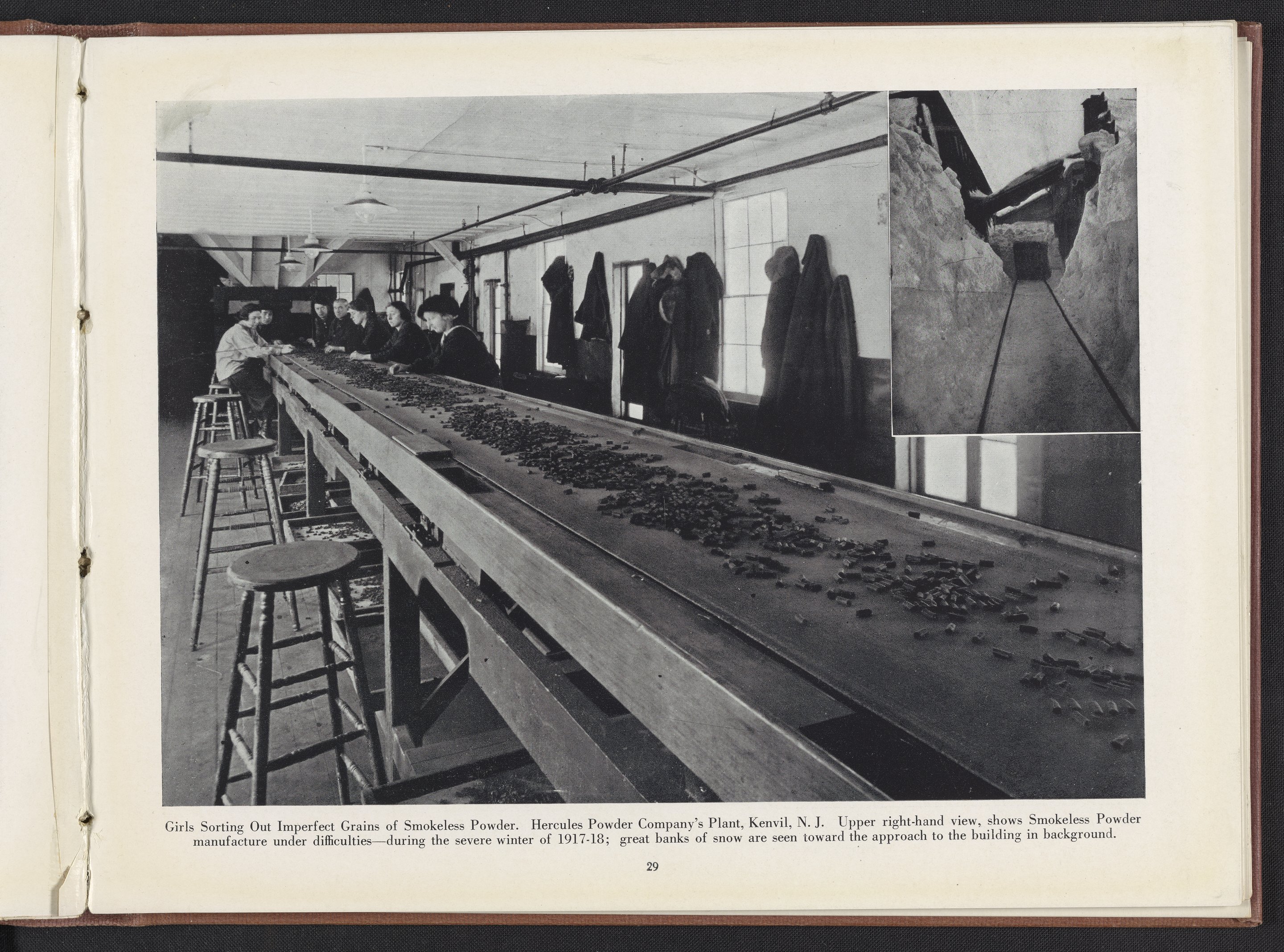 Image caption reads "girls sorting out imperfect grains of smokeless powder." Inset photograph caption states "smokeless powder manufacture under difficulties—during the severe winter of 1917-18; great banks of snow are seen toward the approach to the building in background."