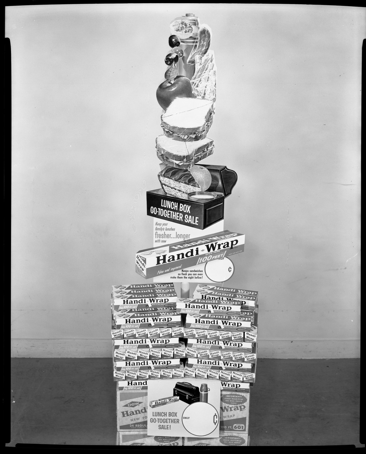 Promotional display advertising a Lunch Box Go-Together sale featuring Dow Handi-Wrap. Several boxes of Handi-Wrap form the base of the display, which is topped with a lunch box and stack of assorted foodstuffs wrapped in Handi-Wrap.