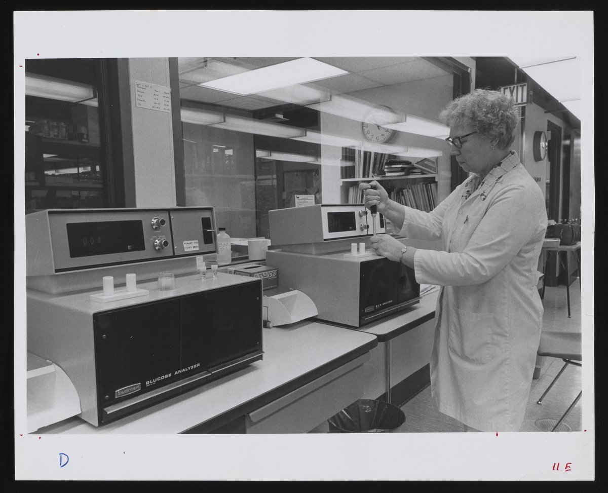 Woman using Beckman Glucose Analyzer and BUN Analyzer