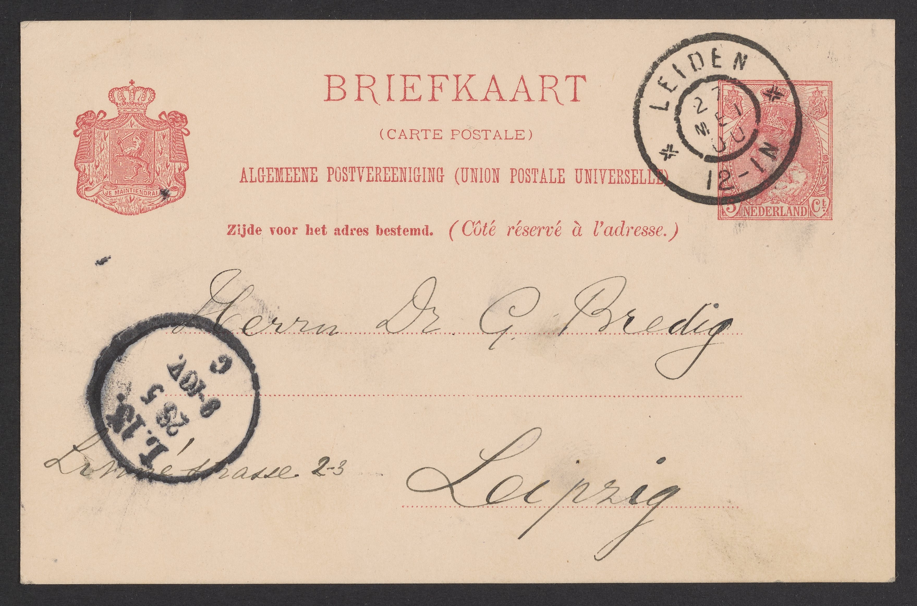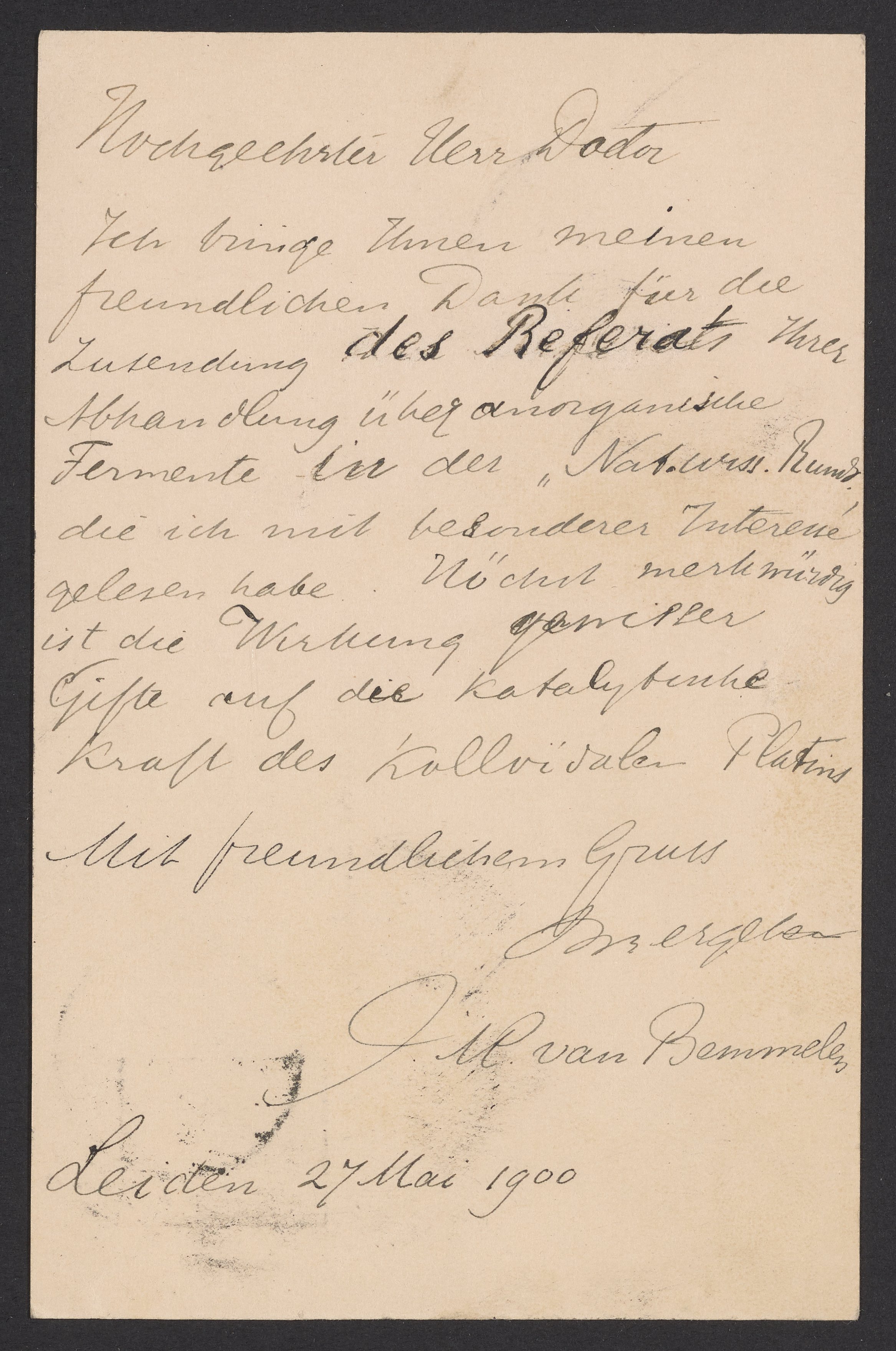 Bemmelen, Jacob Maarten van. “Postcard from Jacob Maarten Van Bemmelen to Georg Bredig,” May 27, 1900. Papers of Georg and Max Bredig, Box 2, Folder 28. Science History Institute. Philadelphia. https://digital.sciencehistory.org/works/7h4yzp0.