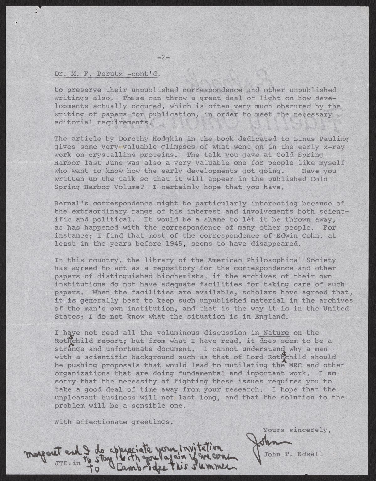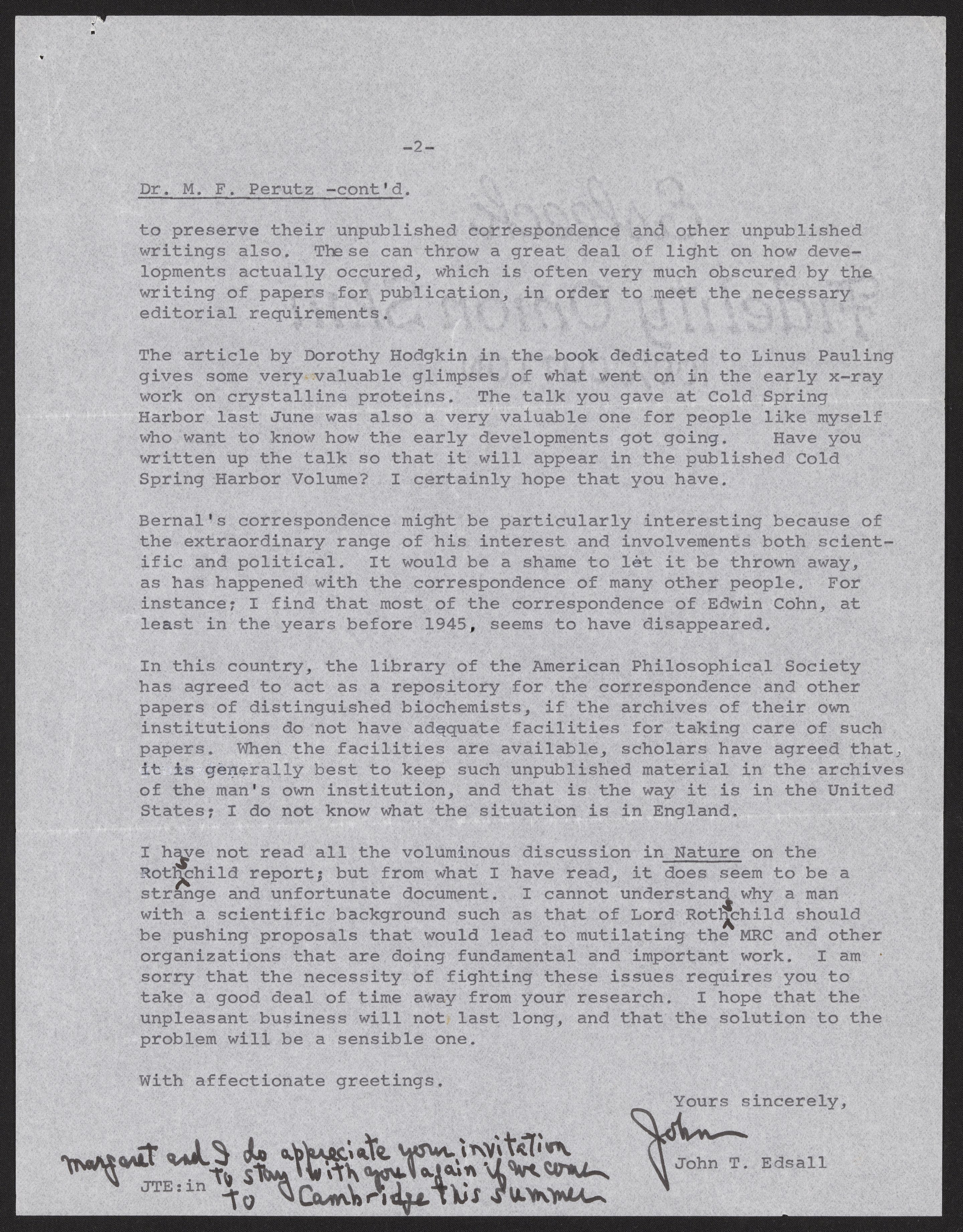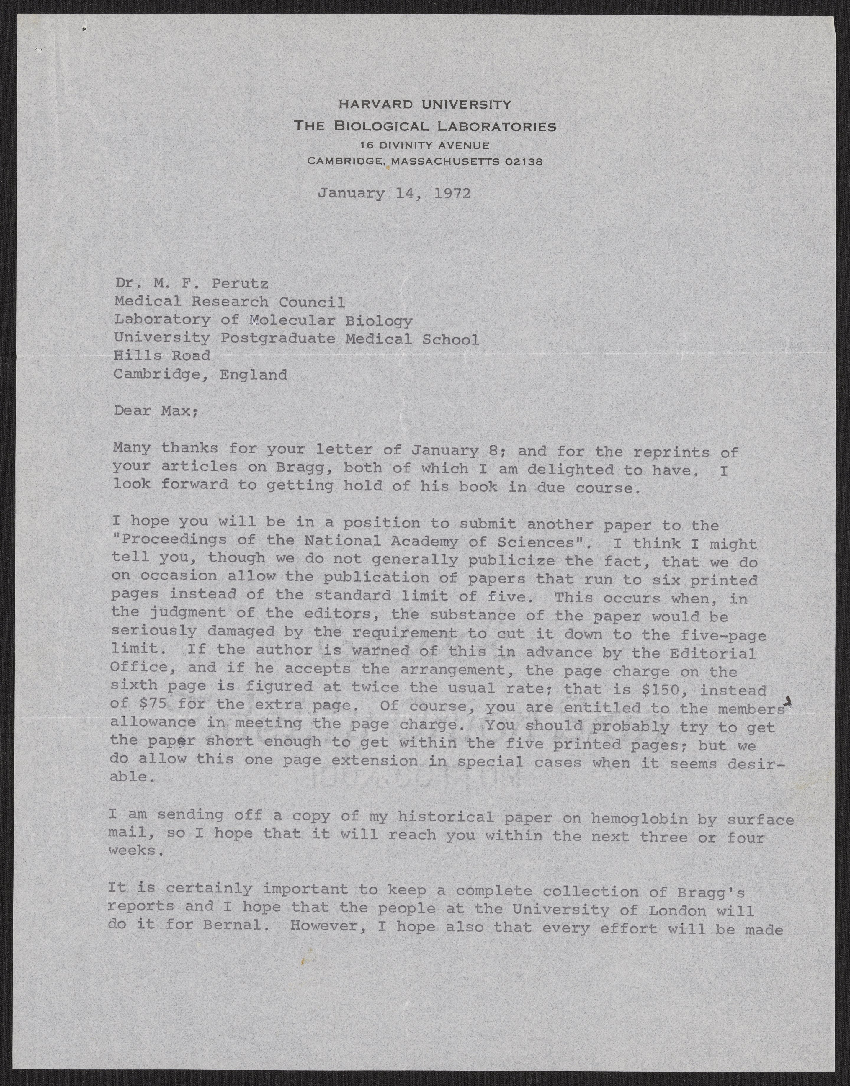 Letter from John T. Edsall to Max Perutz, January 14, 1972
