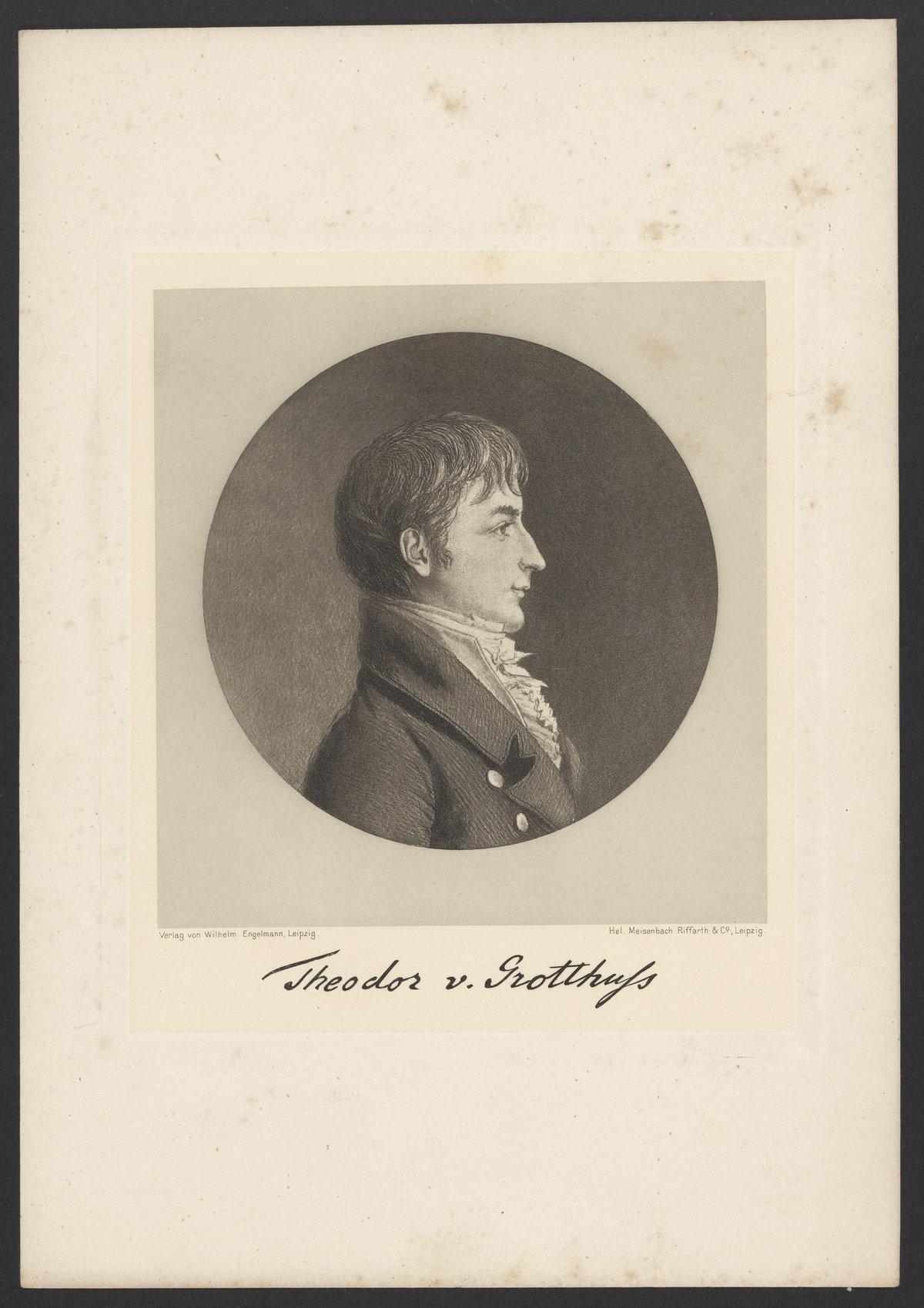 Meisenbach Riffarth & Company. “Portrait of Theodor Von Grotthuss.” Engelmann, Th. W. (Th. Wilhelm), n.d. Papers of Georg and Max Bredig, Box 4, Folder 4. Science History Institute. Philadelphia. https://digital.sciencehistory.org/works/7kb0v7k.