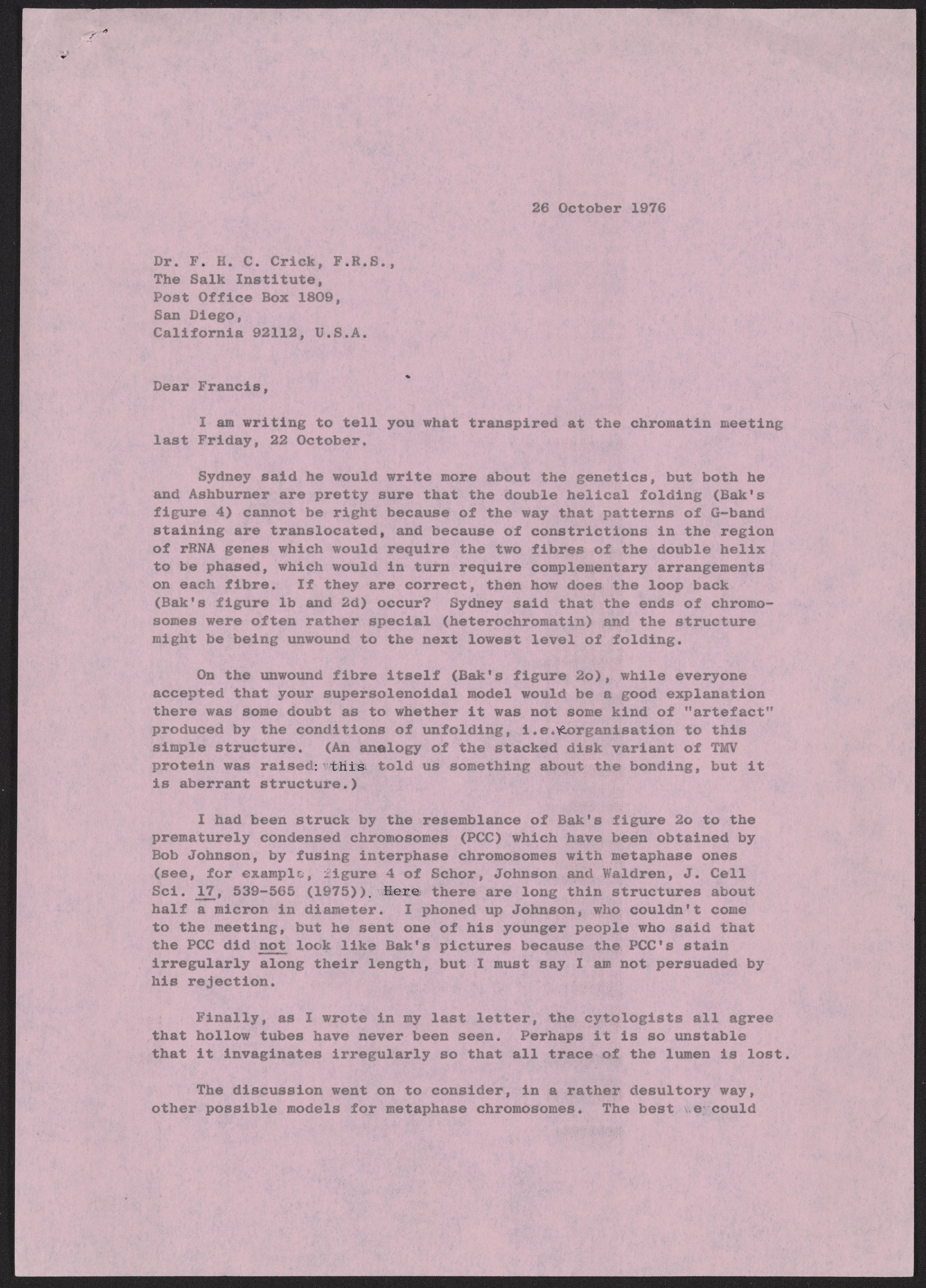Klug, A. (Aaron), Sir. “Letter from Francis Crick to Aaron Klug, October 26, 1976,” October 26, 1976. History of Molecular Biology Collection, Box 10, Folder 25. Science History Institute. Philadelphia. https://digital.sciencehistory.org/works/7lyoely.