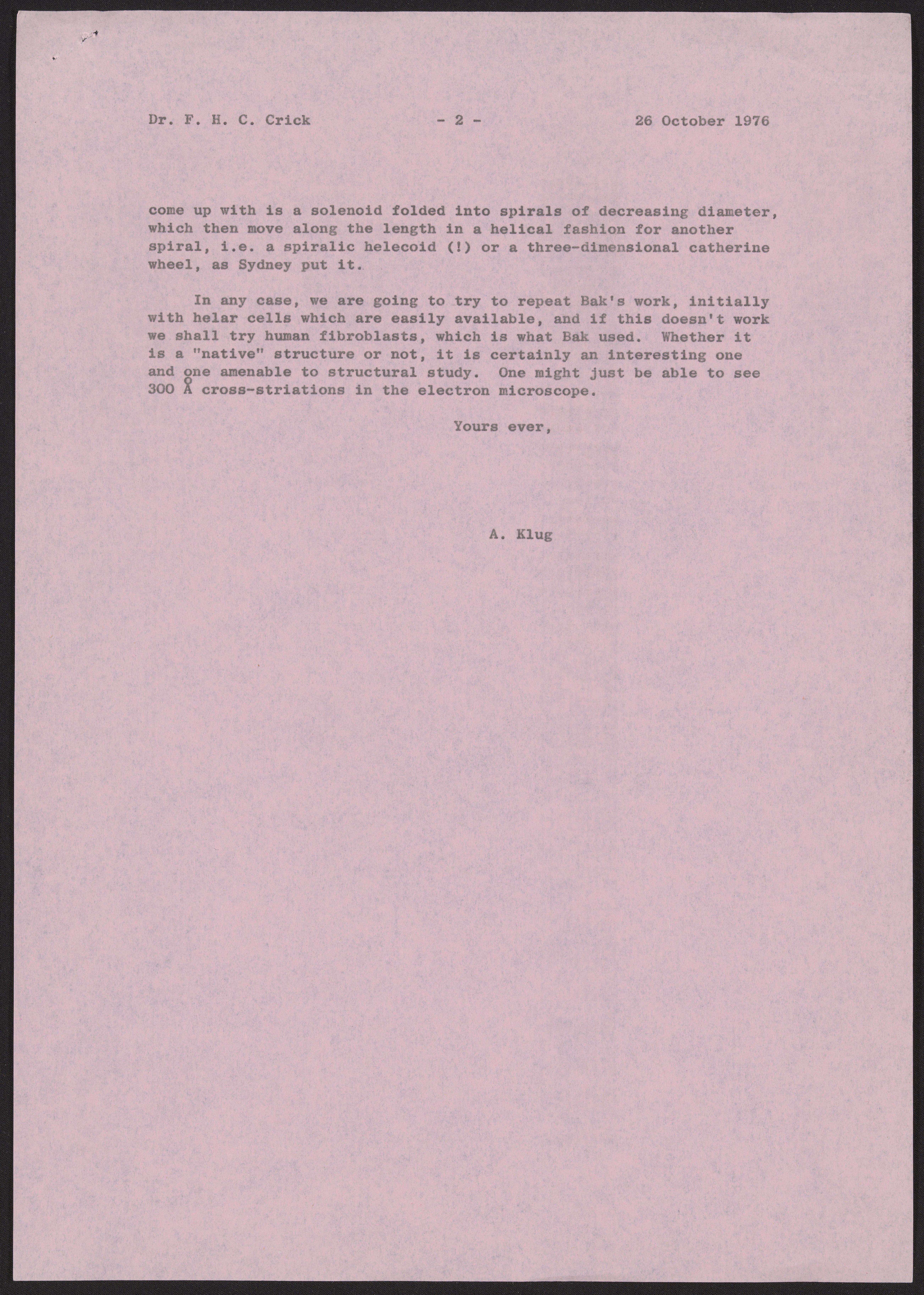 Klug, A. (Aaron), Sir. “Letter from Francis Crick to Aaron Klug, October 26, 1976,” October 26, 1976. History of Molecular Biology Collection, Box 10, Folder 25. Science History Institute. Philadelphia. https://digital.sciencehistory.org/works/7lyoely.