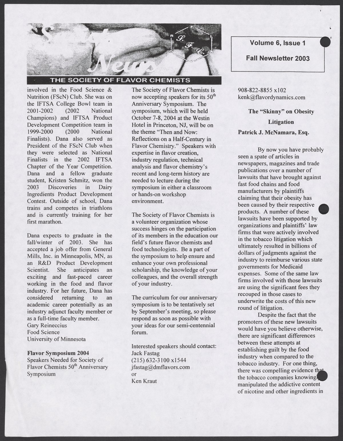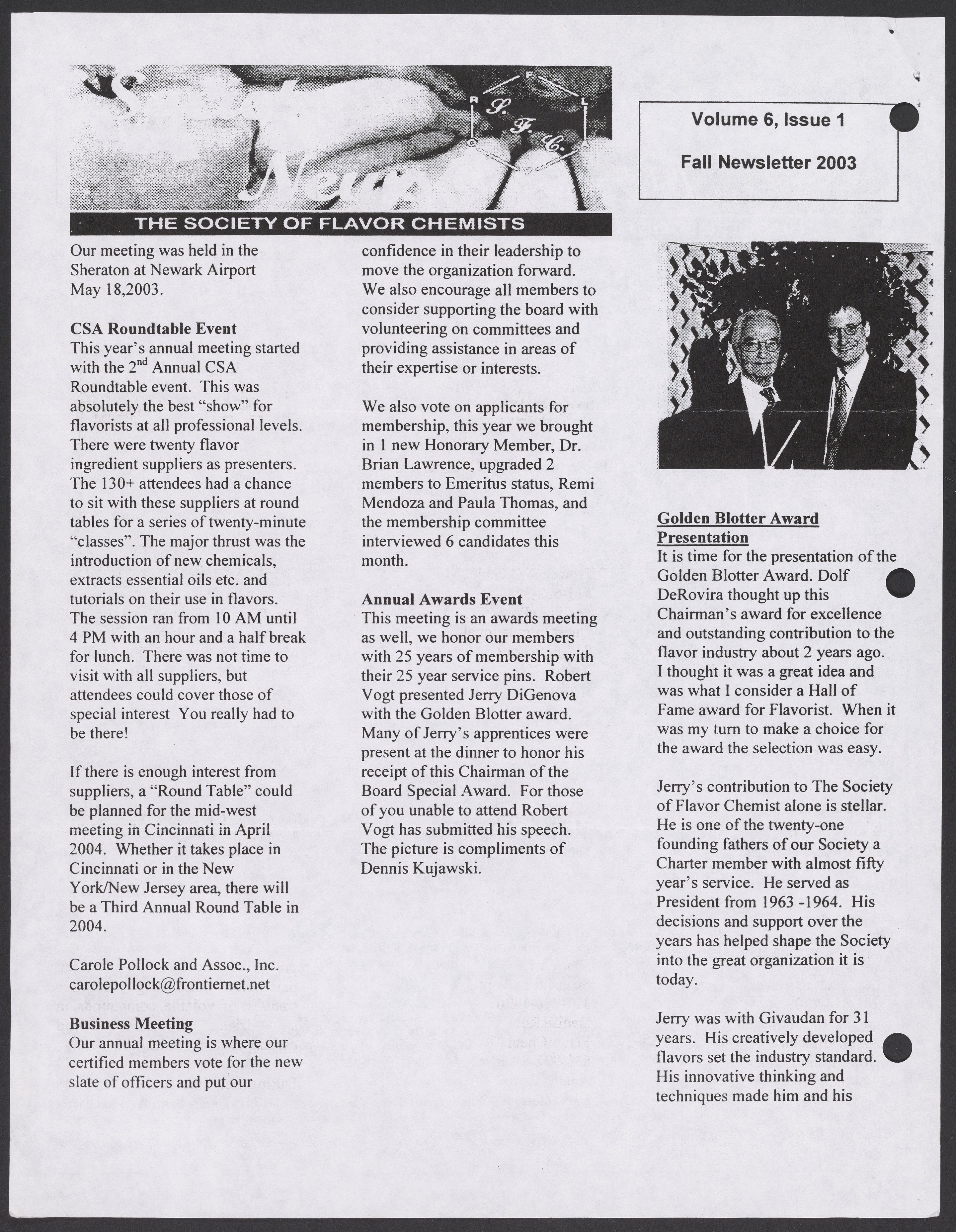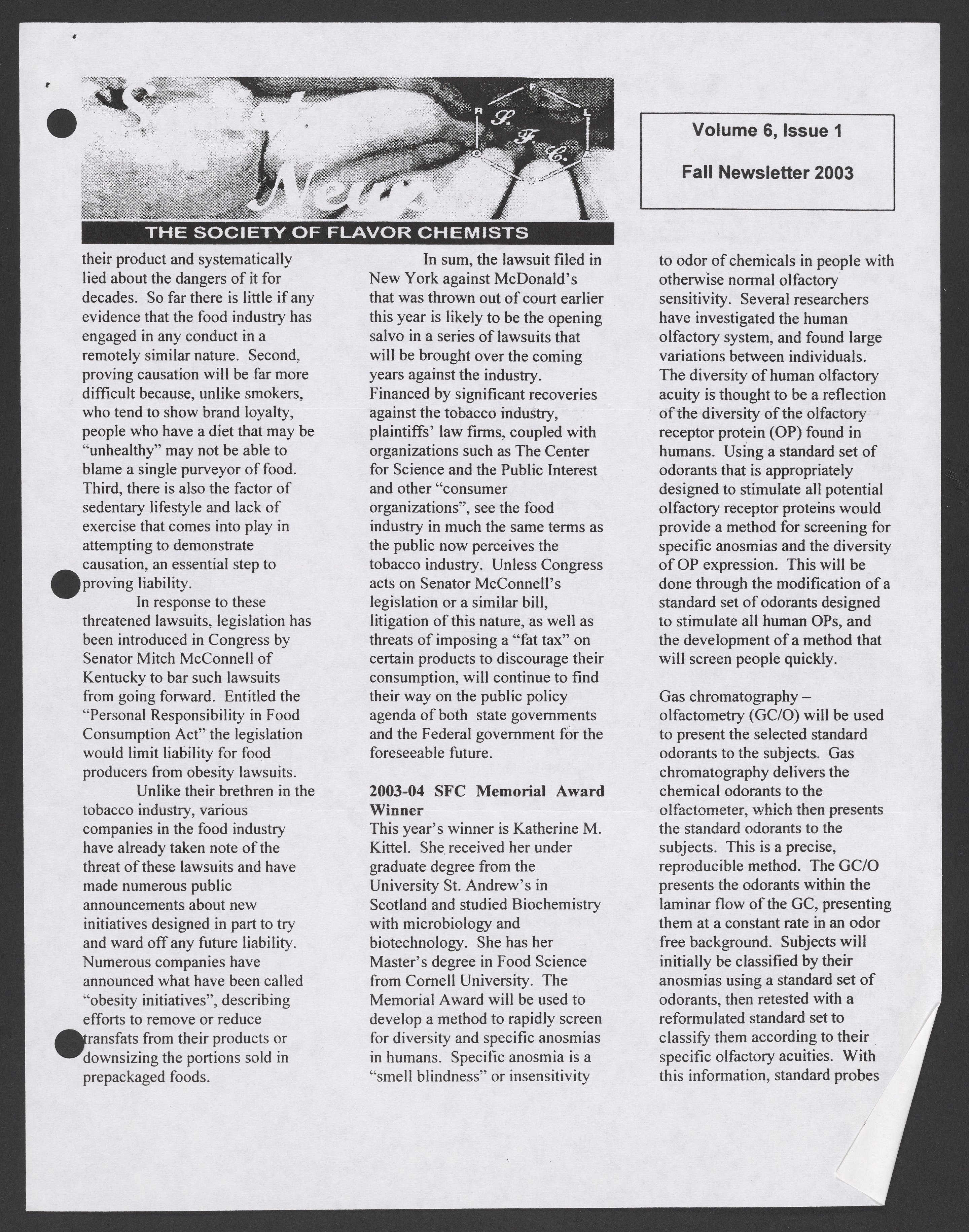 Society of Flavor Chemists. “Society News, Volume 6, Issue 1,” 2003. Society of Flavor Chemists, Society News, Box 1, Folder 2. Science History Institute. Philadelphia. https://digital.sciencehistory.org/works/7n95i17.