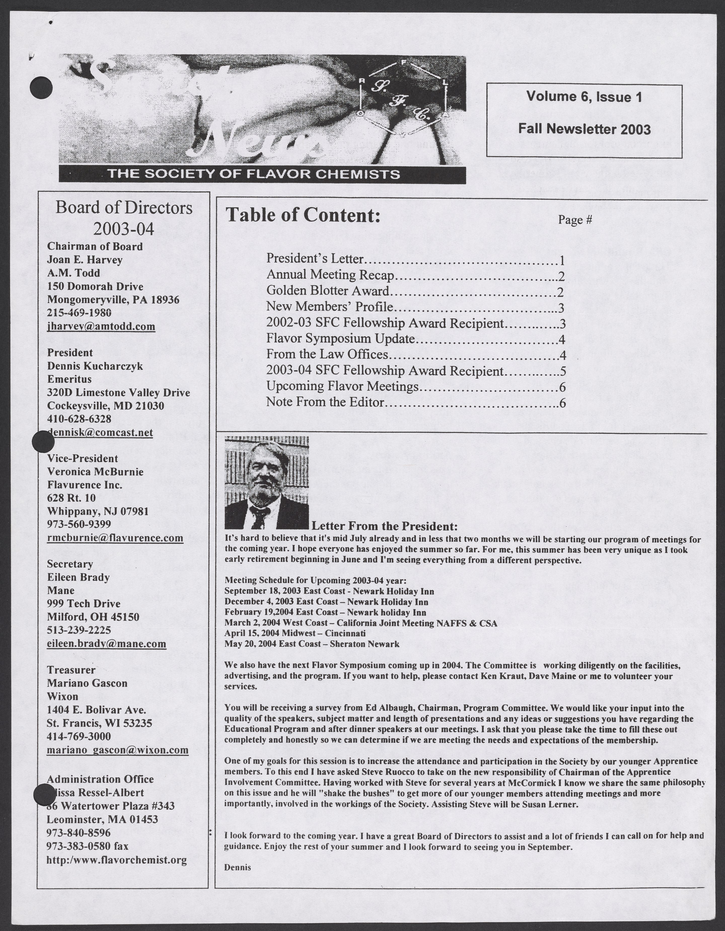 Society of Flavor Chemists. “Society News, Volume 6, Issue 1,” 2003. Society of Flavor Chemists, Society News, Box 1, Folder 2. Science History Institute. Philadelphia. https://digital.sciencehistory.org/works/7n95i17.