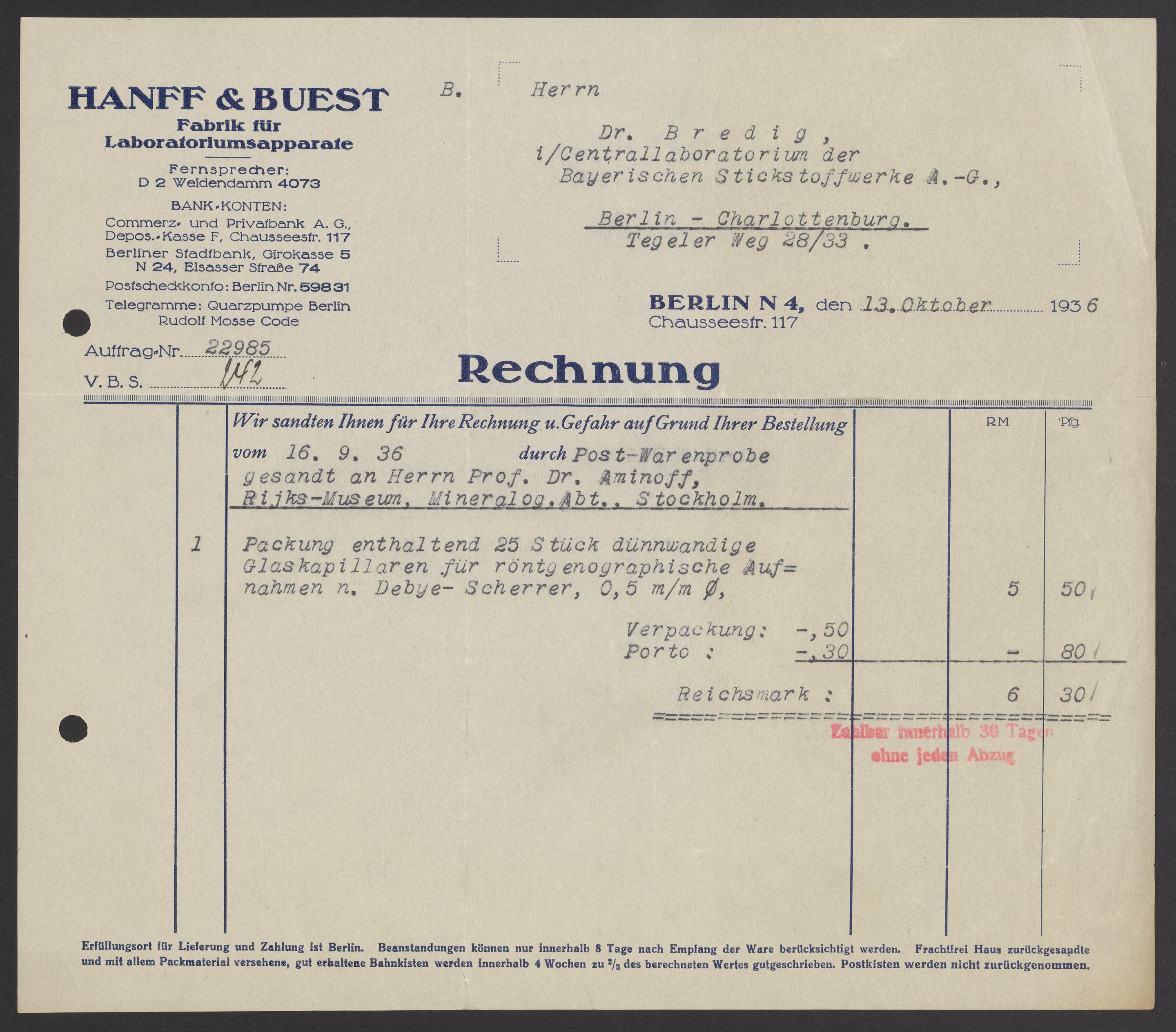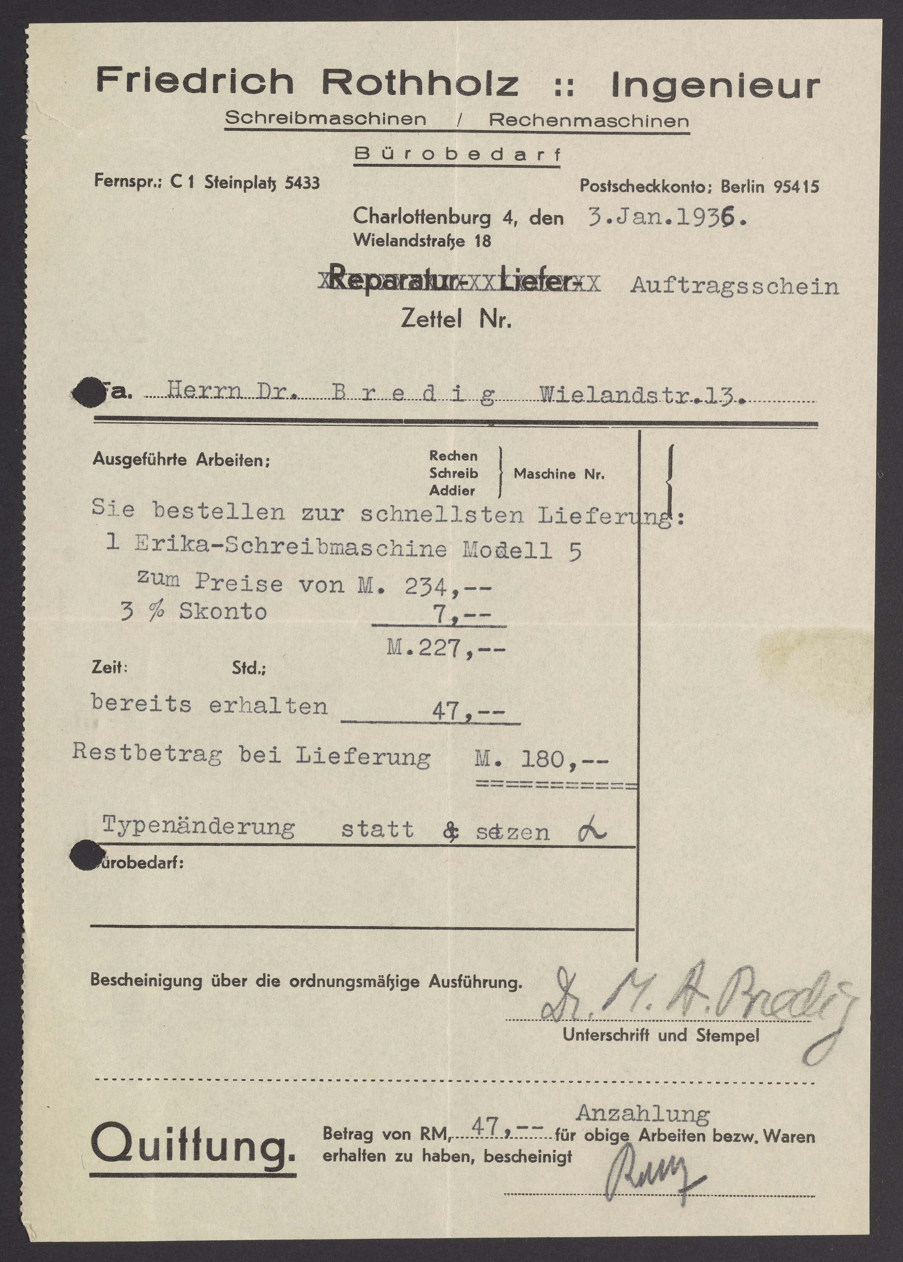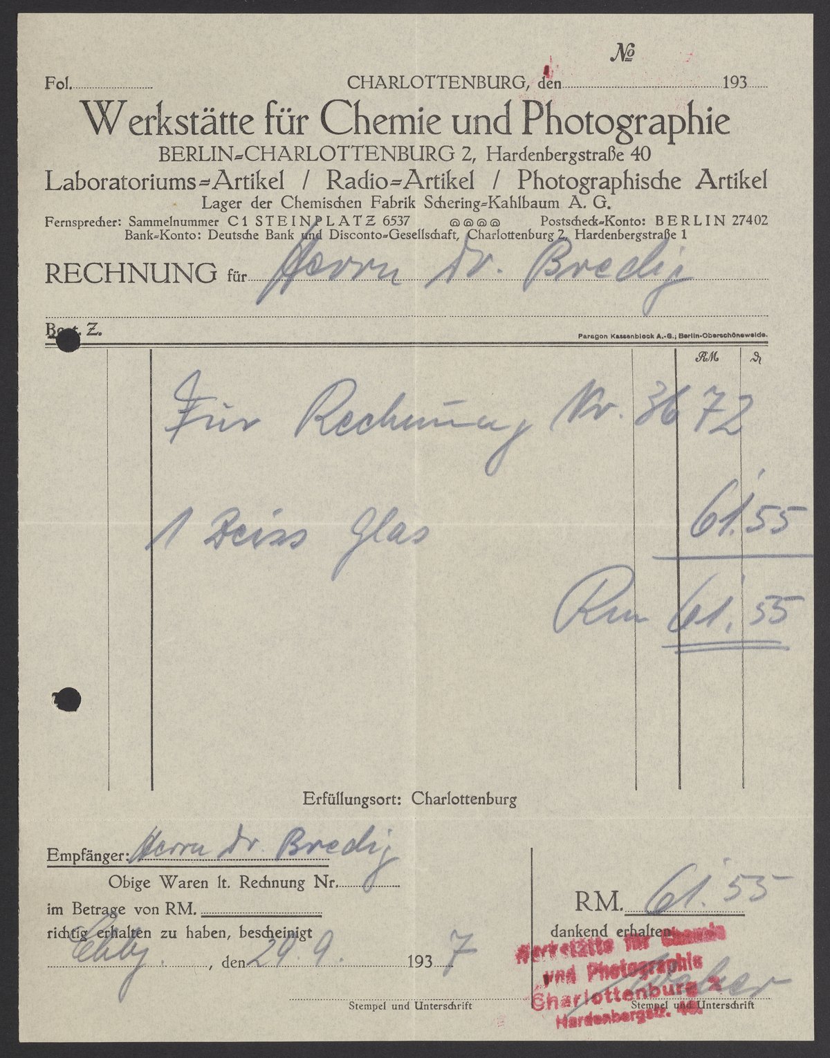 Bredig, Max Albert. “Invoices and Receipts Kept by Max Bredig, 1936-1937,” 1936–1937. Papers of Georg and Max Bredig, Box 10, Folder 20. Science History Institute. Philadelphia. https://digital.sciencehistory.org/works/7p2blaf.
