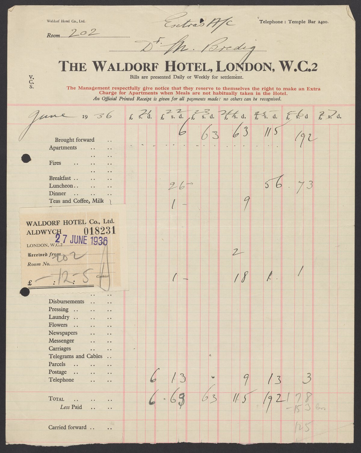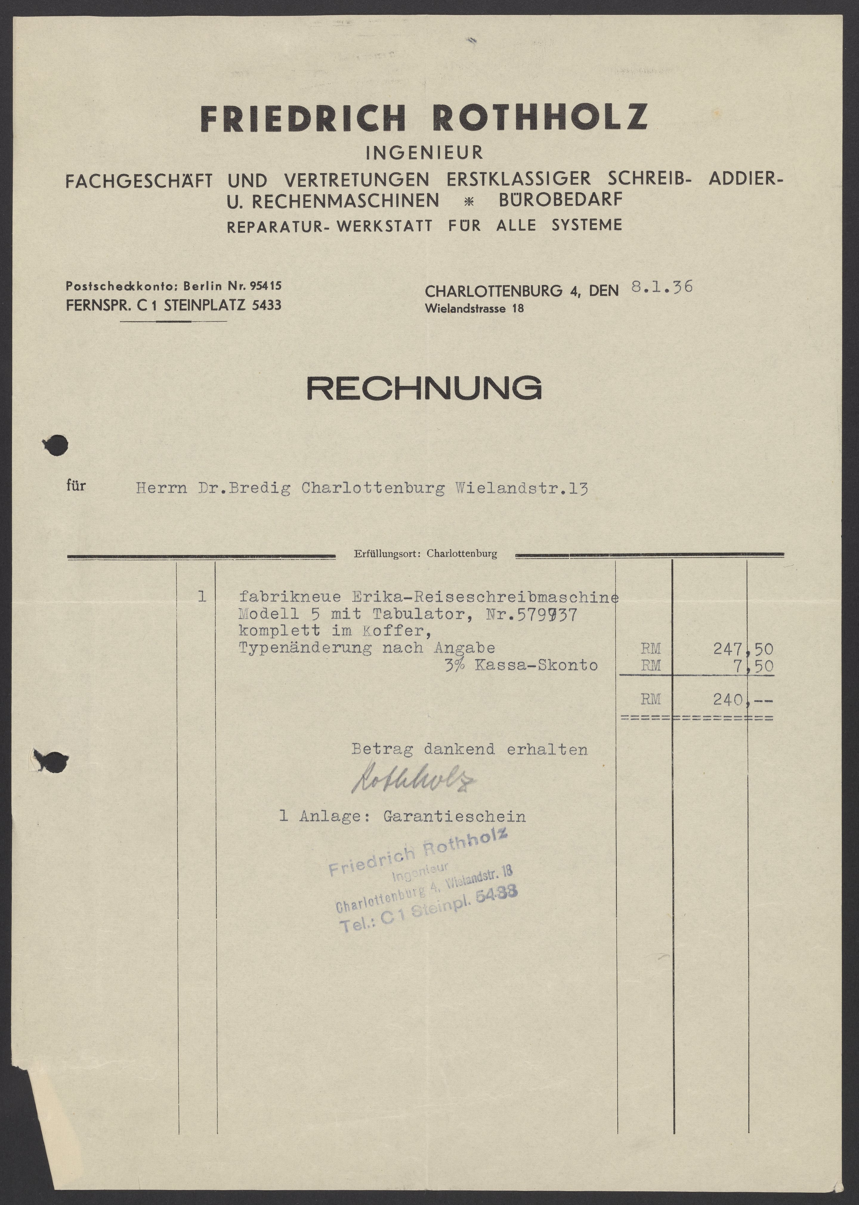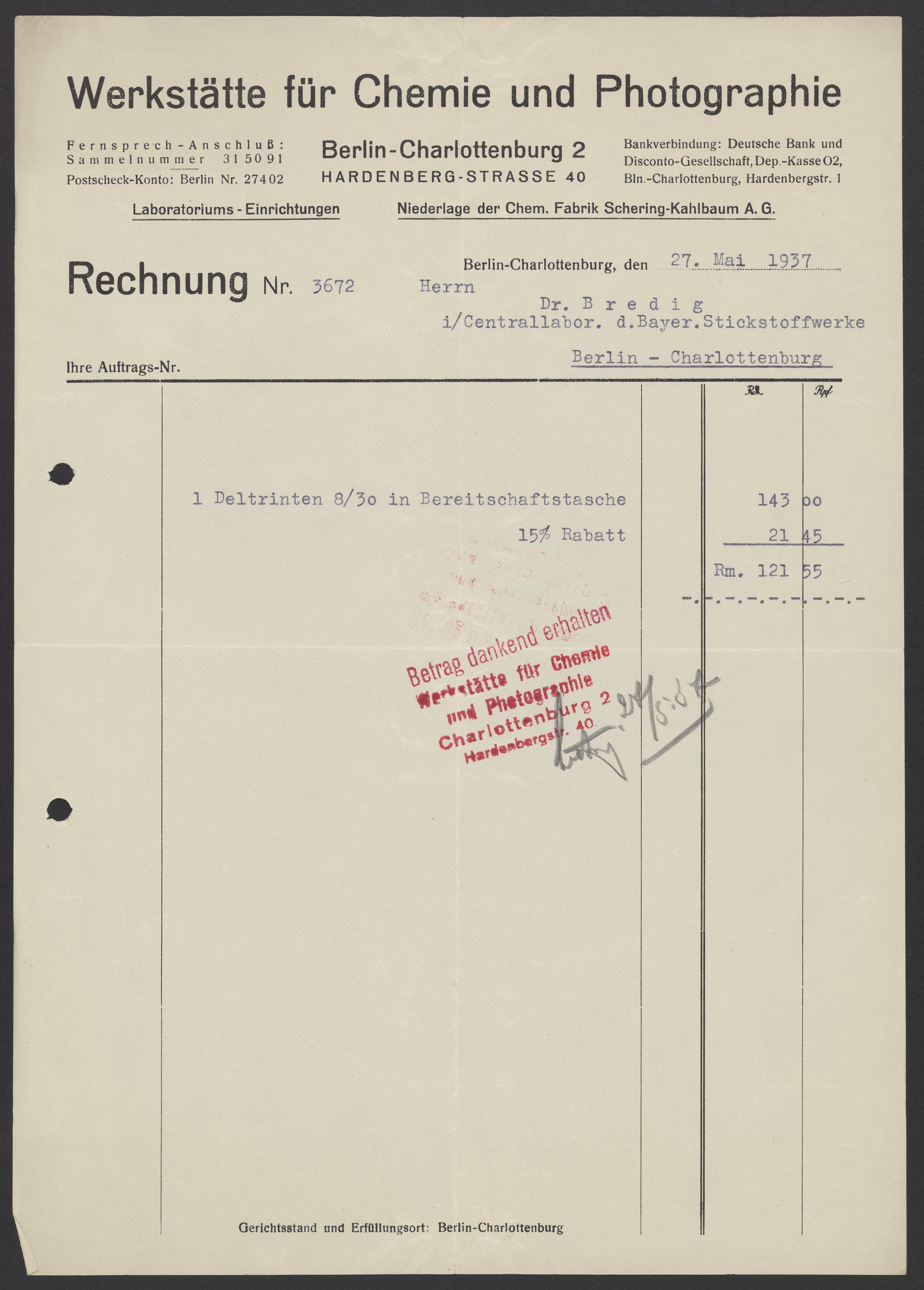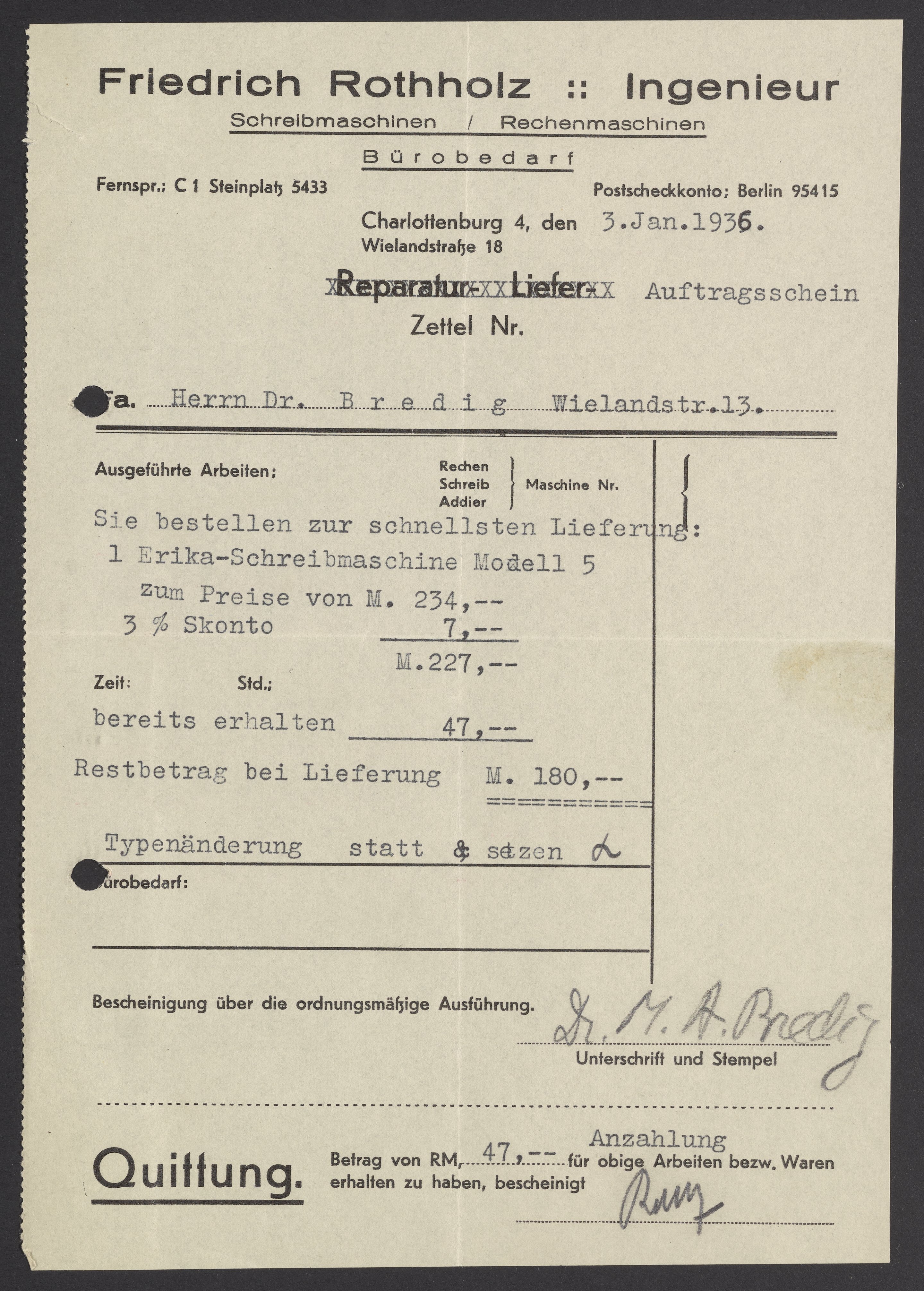 Bredig, Max Albert. “Invoices and Receipts Kept by Max Bredig, 1936-1937,” 1936–1937. Papers of Georg and Max Bredig, Box 10, Folder 20. Science History Institute. Philadelphia. https://digital.sciencehistory.org/works/7p2blaf.
