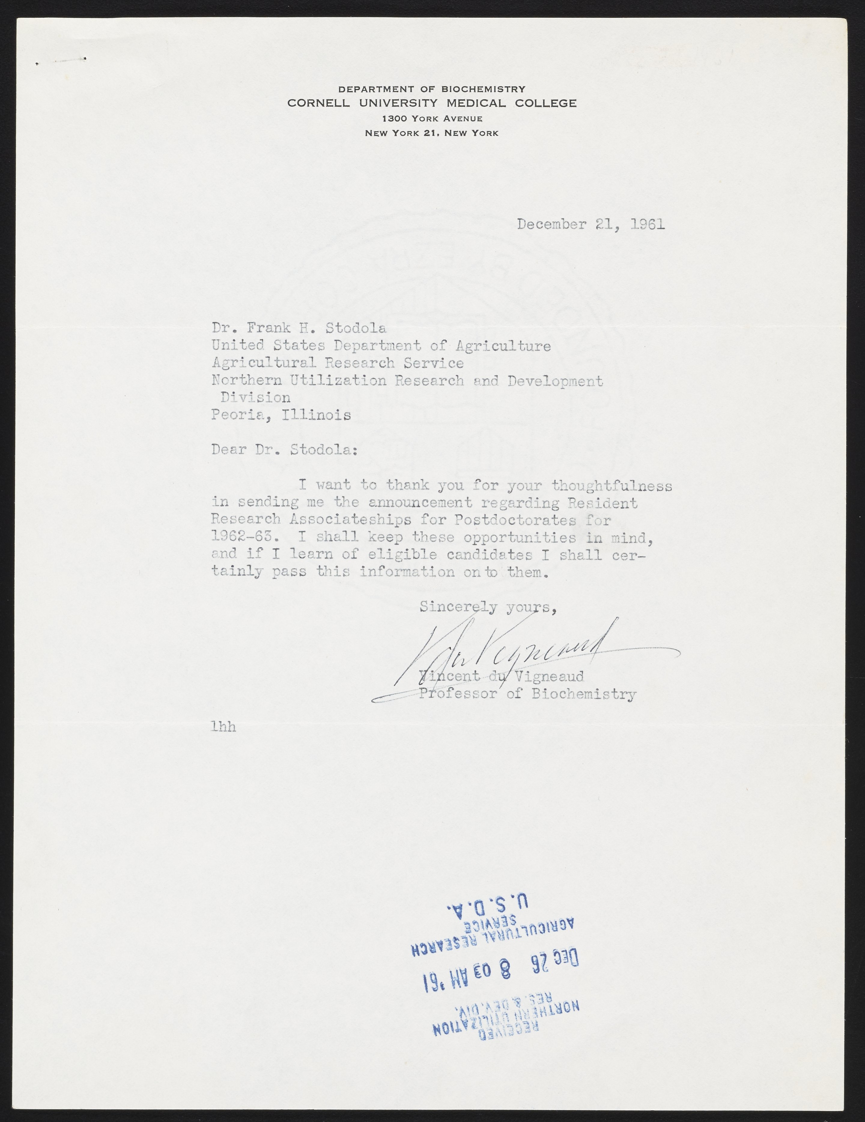 Vigneaud, Vincent Du. “Letter from Vincent Du Vigneaud to Frank Stodola,” December 21, 1961. Frank H. Stodola Nobel Laureate Letter Collection, Box 1. Science History Institute. Philadelphia. https://digital.sciencehistory.org/works/7p88cg57g.