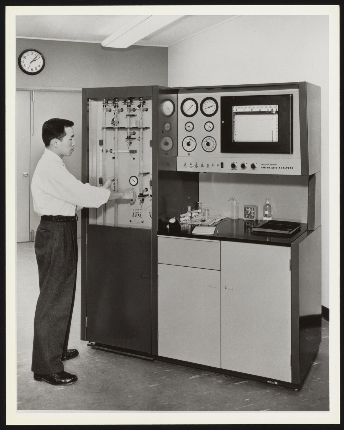 Unidentified man using a Beckman/Spinco Model 120 Amino Acid Analyzer