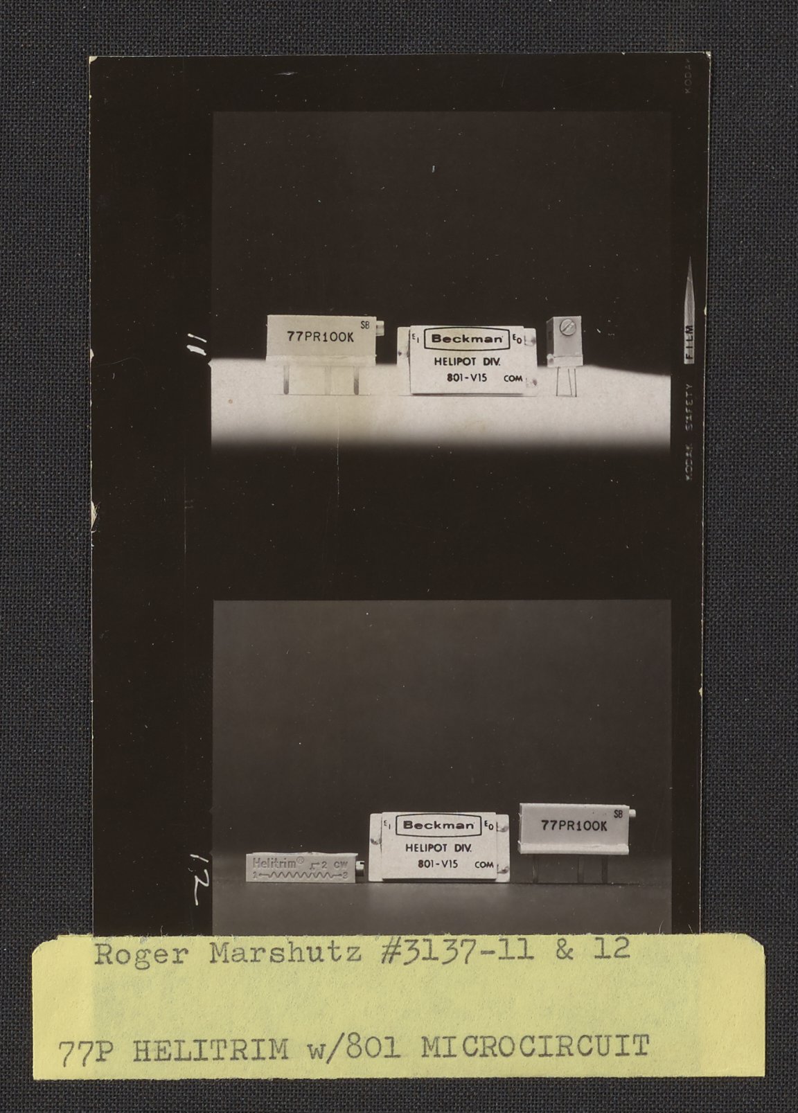 Roger Marshutz Photography. “Model 77P Helitrim Potentiometer with Model 801 Microcircuit,” 1950–1969. Beckman Historical Collection, Box 85. Science History Institute. Philadelphia. https://digital.sciencehistory.org/works/7p88cg965.