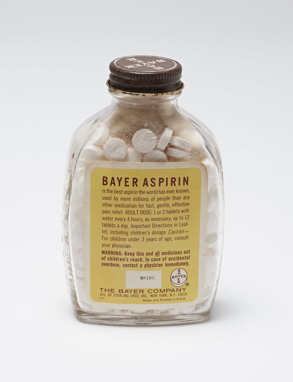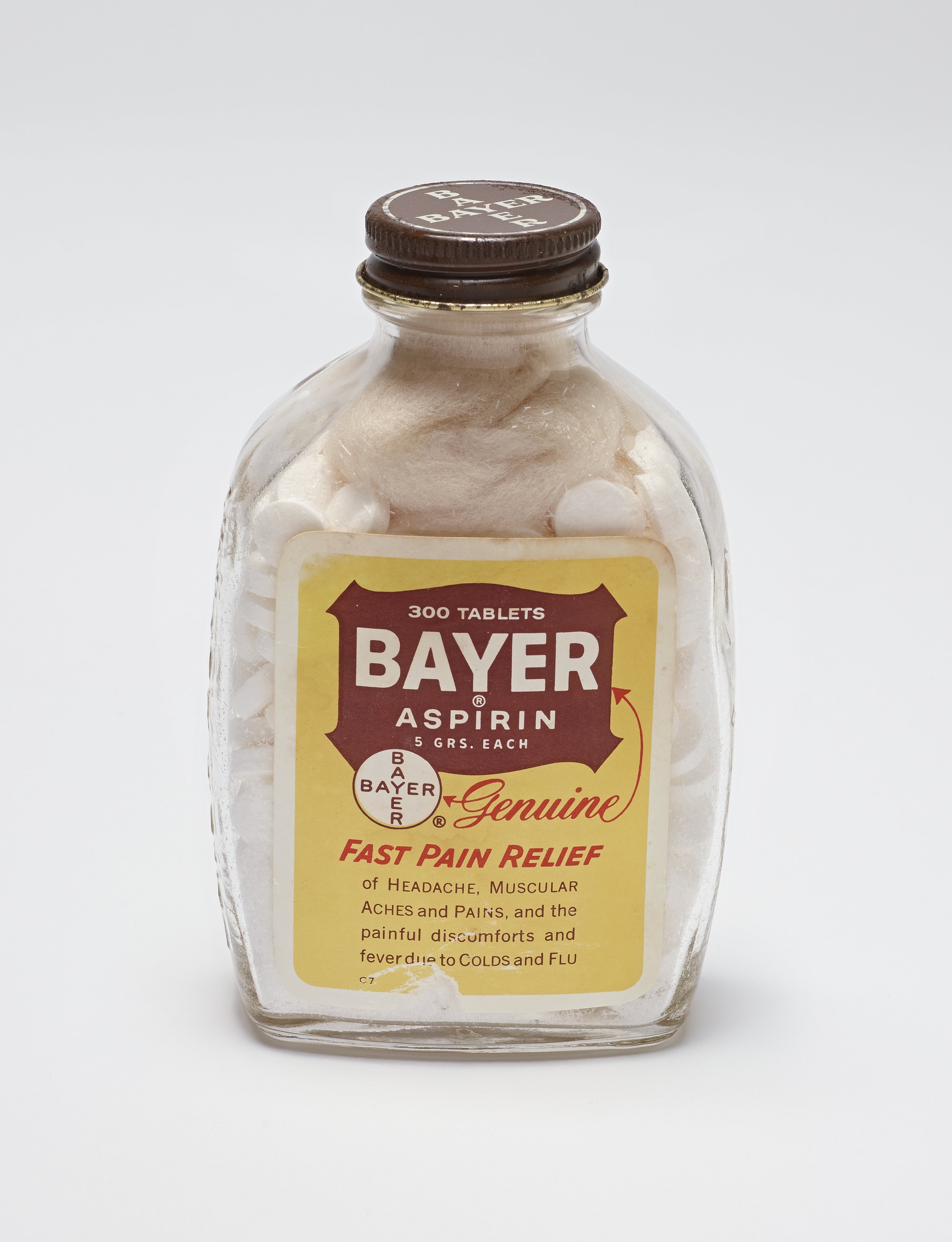 Science History Institute. Glass Bayer Aspirin Bottle, 300 Tablet Size. Photograph, 2017. Science History Institute. Philadelphia. https://digital.sciencehistory.org/works/7p88cg990.