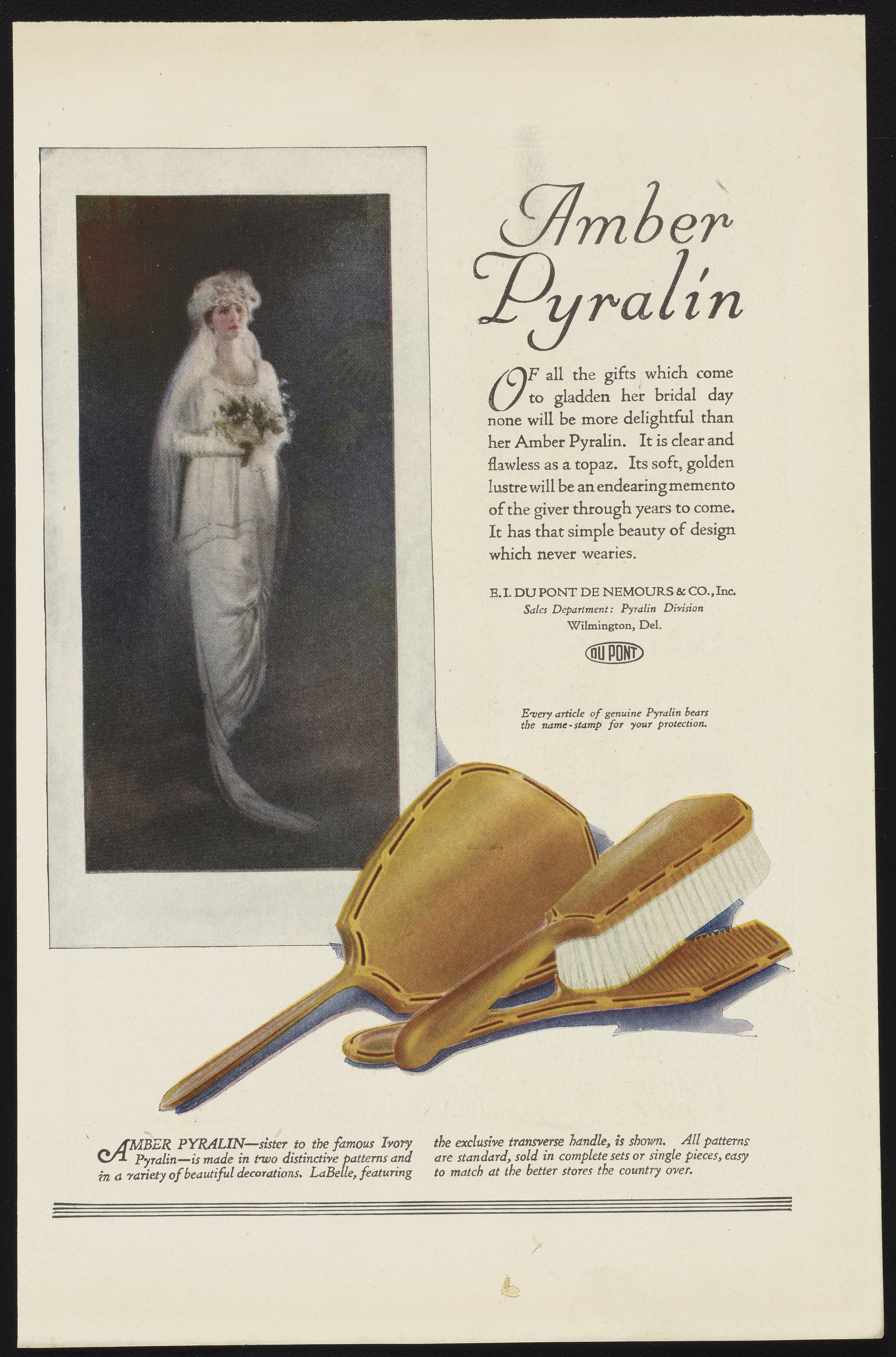 Color printed advertisement for Amber Pyralin, a brand name for Du Pont celluloid, depicts a bride holding a bouquet of flowers. An image of a brush, comb and mirror made with amber pyralin is depicted in the lower half of the page.