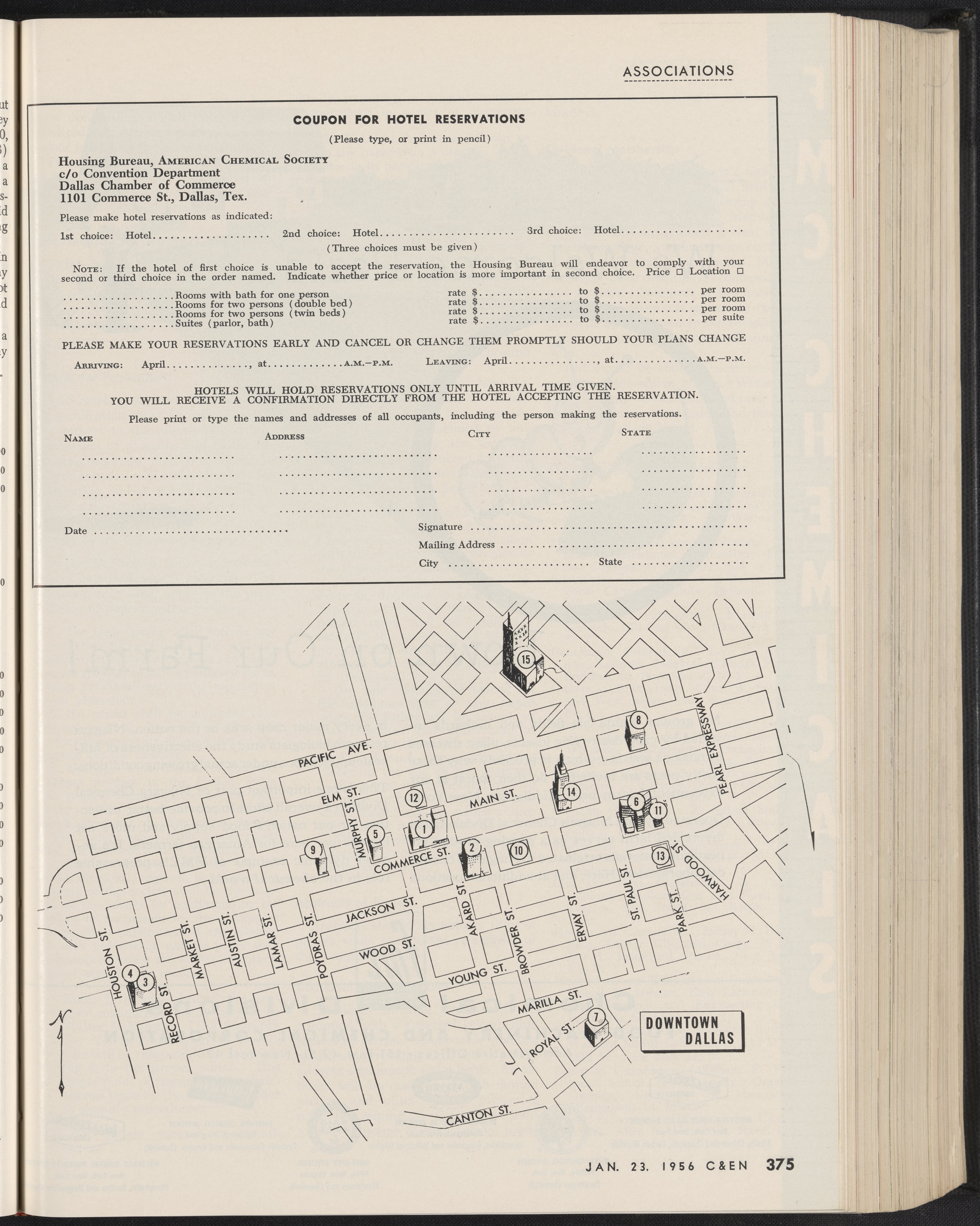 Pages 374 and 375 of Chemical and Engineering News, Volume 34, Issue 4. These two pages features Dallas, Texas hotel rates and a map of the downtown area for the 1956 American Chemical Society convention.