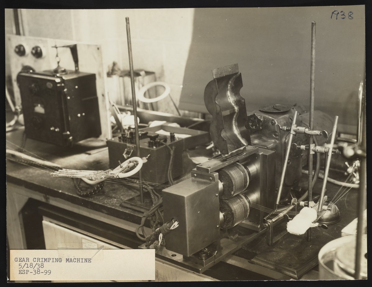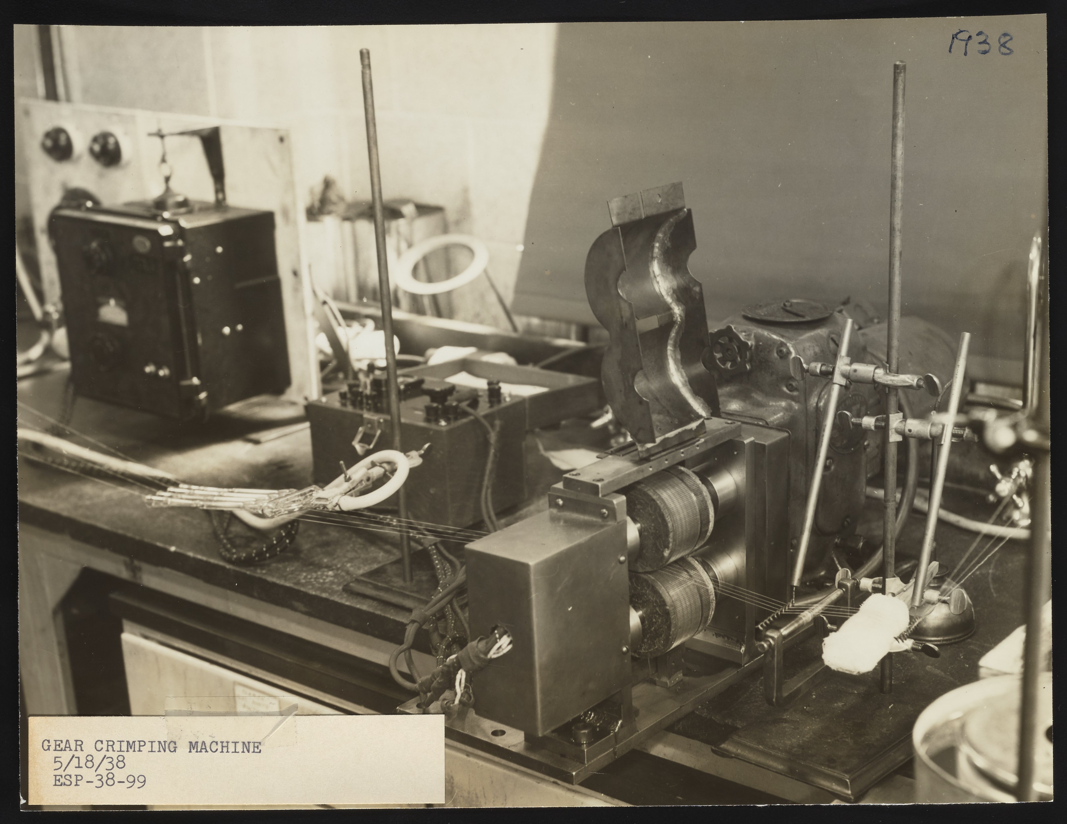 “Gear Crimping Machine at DuPont Experimental Station,” May 18, 1938. Joseph X. Labovsky Collection of Nylon Photographs and Ephemera, Box 2. Science History Institute. Philadelphia. https://digital.sciencehistory.org/works/7s75dc423.