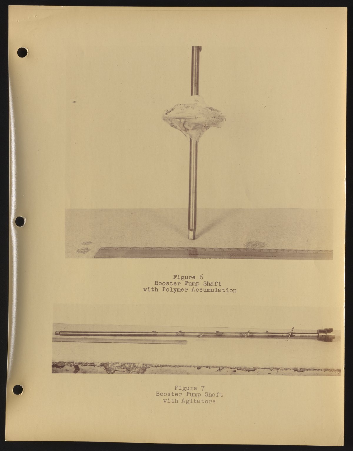 Two views of a booster pump shaft used during the early stages of synthetic fiber production and research at DuPont. In the top image, an accumulation of polymer is visible on the shaft, while agitators are wrapped around the shaft on the bottom image. The images are captioned "Figure 6" and "Figure 7," indicating that they appeared in a report or publication.