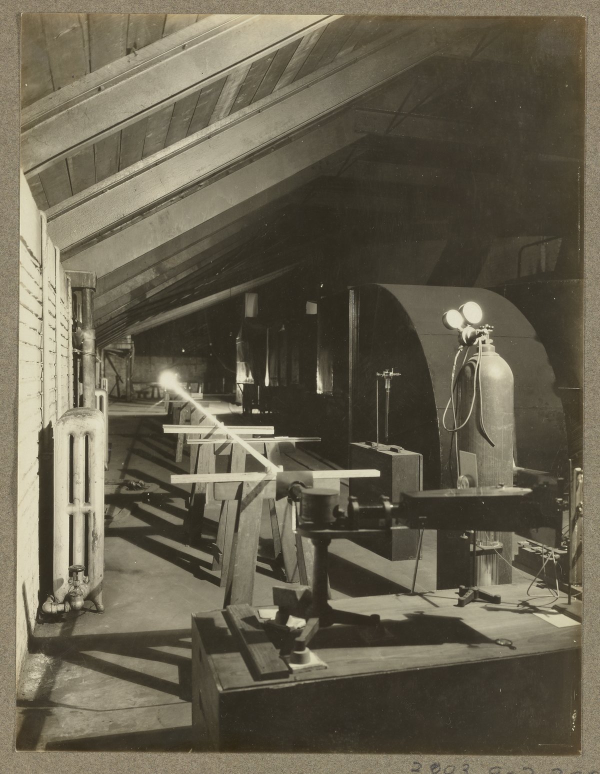 General view of an apparatus used to study the absorption spectrum of ozone in visible and photographic infra red. This apparatus was used at the U.S. Department of Agriculture's Fixed Nitrogen Research Laboratory located in Washington, D.C.