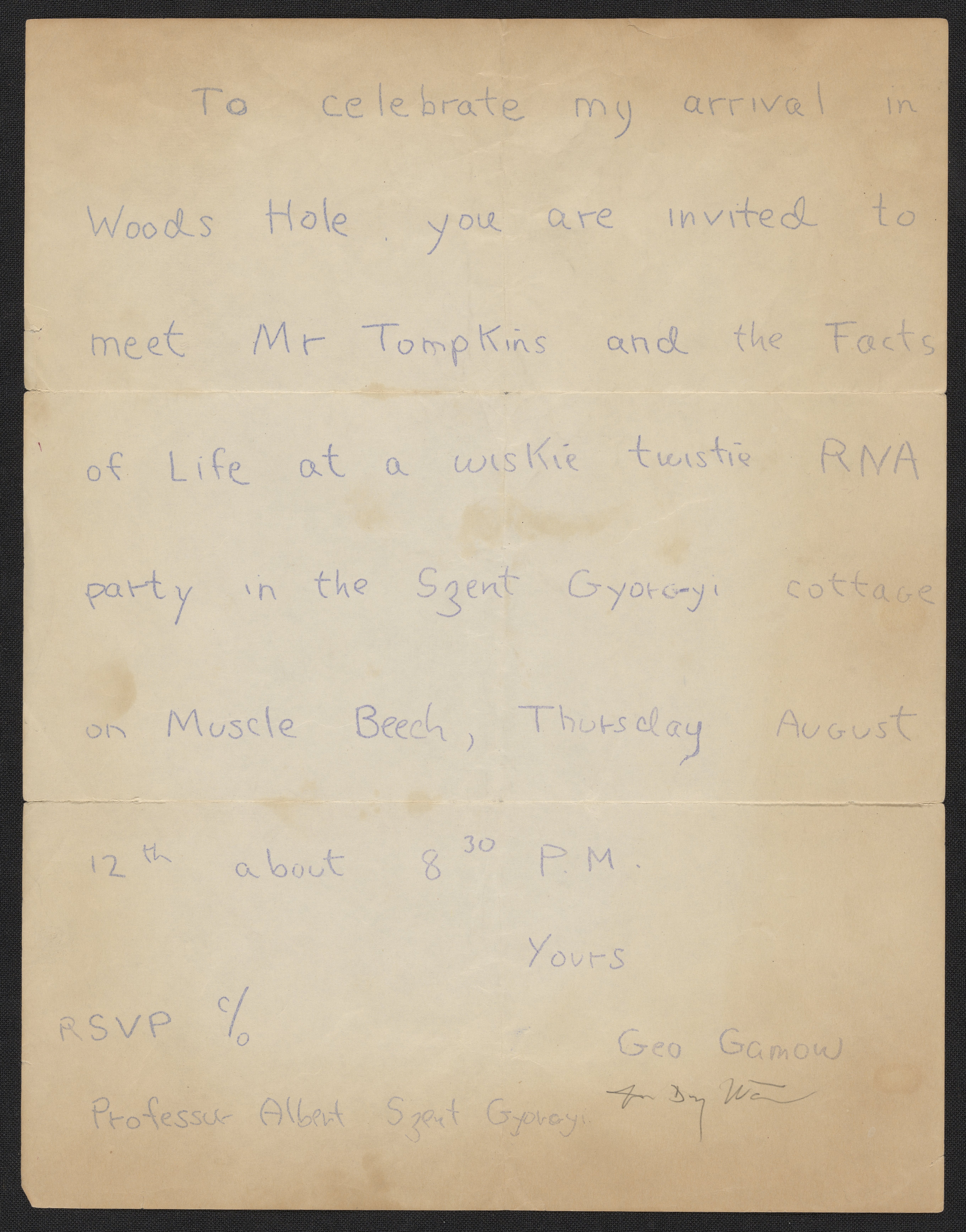 Small JPG1200 x 1530px — 187 KBLarge JPG2880 x 3672px — 1.3 MBFull-sized JPG5442 x 6939px — 5.3 MBOriginal fileTIFF — 5442 x 6939px — 108 MBInvitation to a "wiskie twisty" RNA party, written by James D. Watson (1928-2025), signed in the style of George Gamow (1904-1968). This party was for members of the RNA Tie Club, an informal scientific club founded by Gamow. This club was formed during the summer of 1954, when Gamow, Watson, Francis Crick (1916-2004), and Sydney Brenner (1927-2019) discussed genetics at Woods Hole, on Cape Cod.