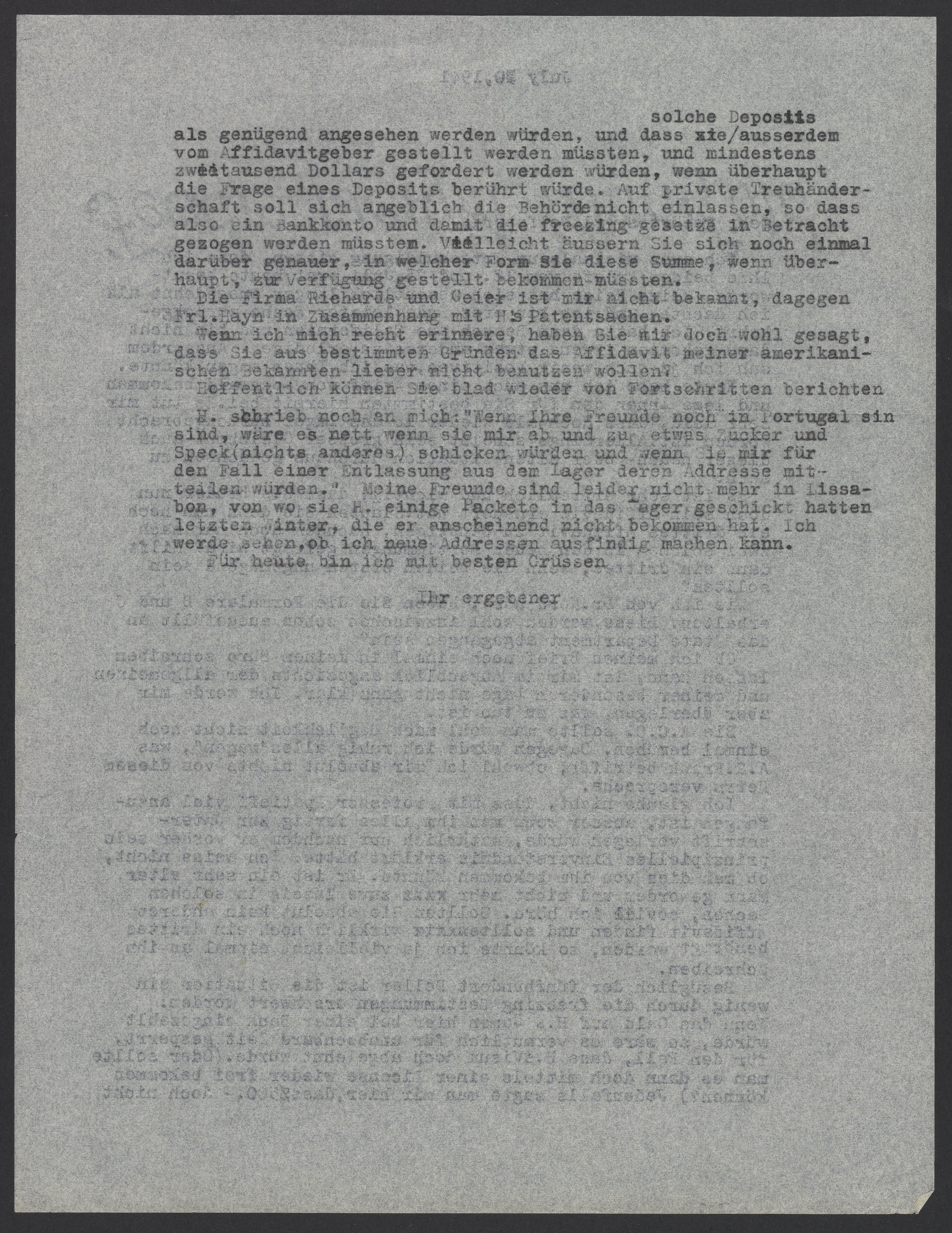 Ich glaube nicht, dass mit Professor Ipatieff viel anzufangen ist, ausser wenn man ihm alles fertig zur Unterschrift vorlegen würde, natürlich nur nachdem er vorher sein prinzipielles Einverständnis erklärt hätte. Ich weiss nicht, ob man dies von ihm bekommen könnte. Er ist ein sehr alter Mann geworden und nicht mehr zuverlässig in solchen Sachen, soviel ich höre. Sollten Sie absolut kein Affidavit finden und sollte wirklich noch ein drittes benötigt werden, so könnte ich ja vielleicht einmal an ihn schreiben.