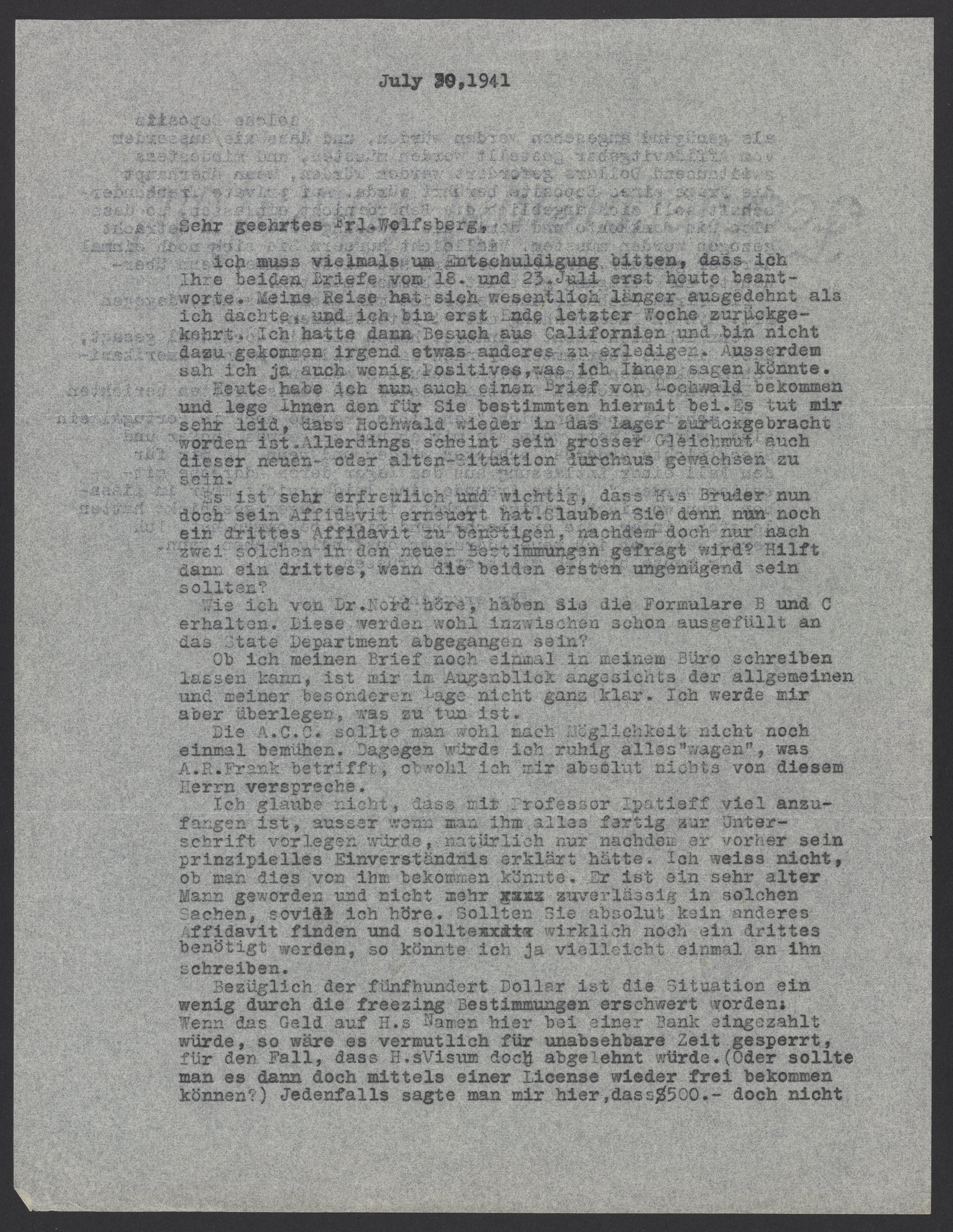 Regarding the five hundred dollars, freezing regulations have complicated the situation. If the money were deposited here at a bank in Hochwald’s name, it would probably be blocked indefinitely, especially if Hochwald’s visa would be rejected. (Perhaps you could obtain access by means of a license?) In any case, I heard that $500