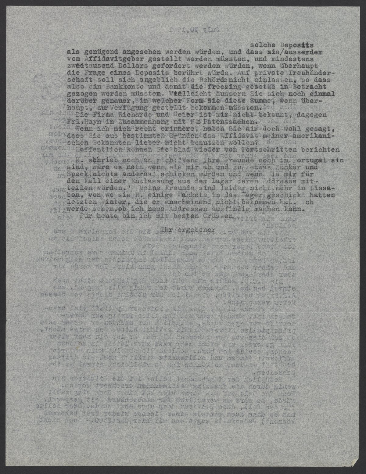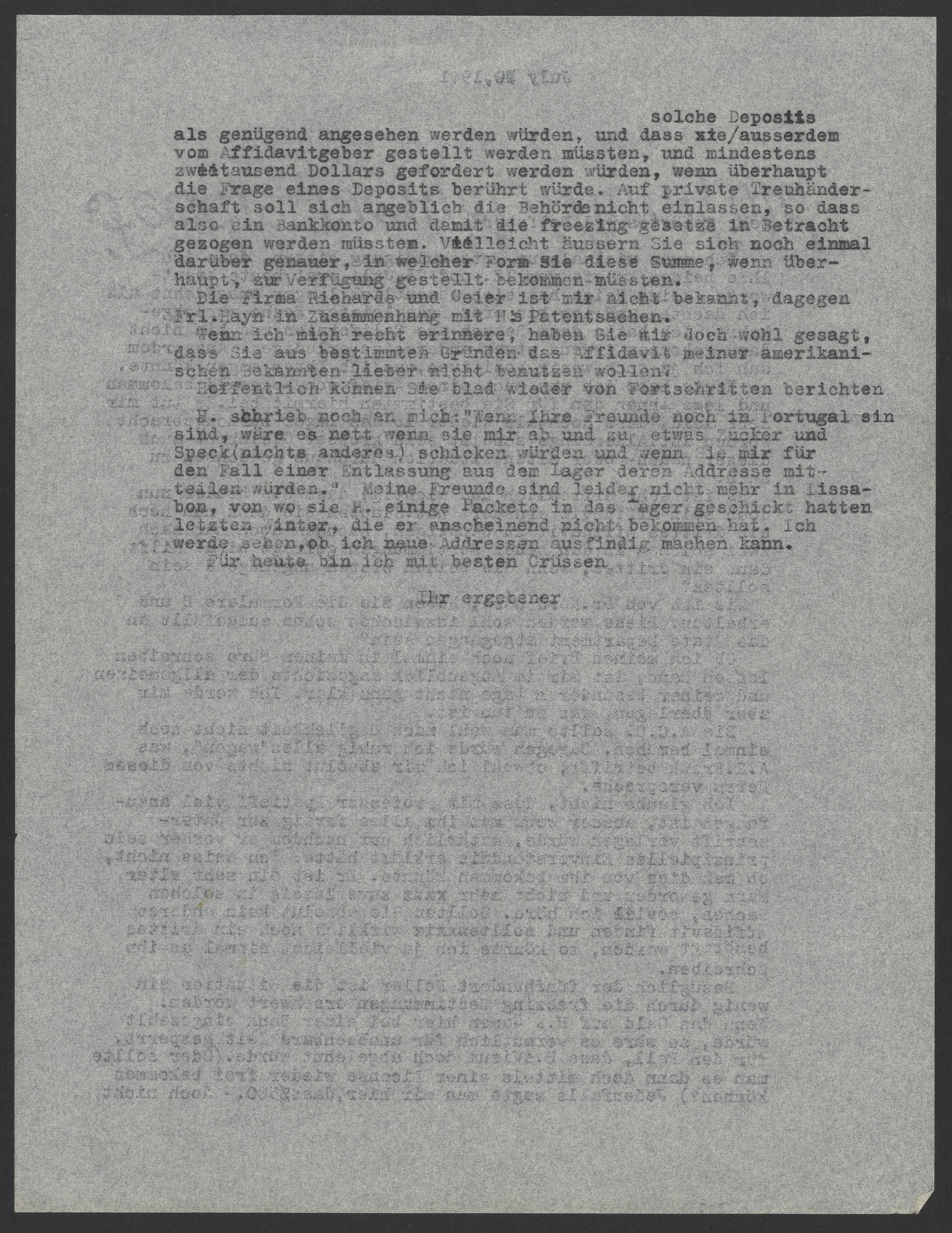 als genügend angesehen werden würden, und dass solche Deposits ausserdem vom Affidavitgeber gestellt werden müssen, und mindestens zweitausend Dollars gefordert werden würden, wenn überhaupt die Fragen eines Deposits berührt würde. Auf private Treuhänderschaft soll sich angeblich die Behörde nicht einlassen, so dass also ein Bankkonto und damit die freezing gesetzte in Betracht gezogen werden müssten. Vielleicht äussern Sie sich noch einmal darüber genauer, in welcher Form Sie diese Summe, wenn ueberhaupt, zur Verfuegung gestellt bekommen müssten.