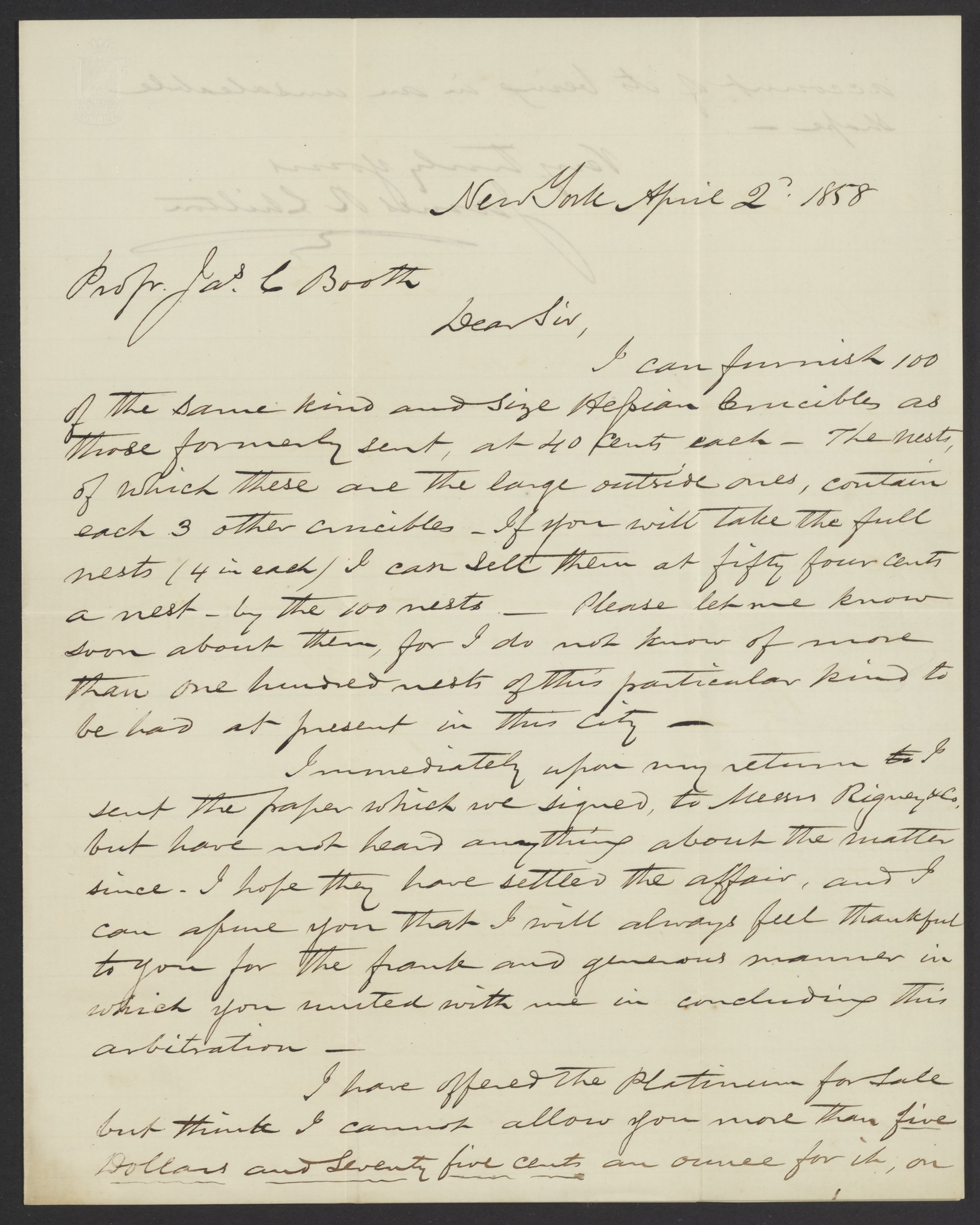 Chilton, James R., Dr. “Letter from Dr. J.R. Chilton to James Curtis Booth, April 2, 1858,” April 2, 1858. Papers of James Curtis Booth, Box 1, Folder 7. Science History Institute. Philadelphia. https://digital.sciencehistory.org/works/7t0113f.