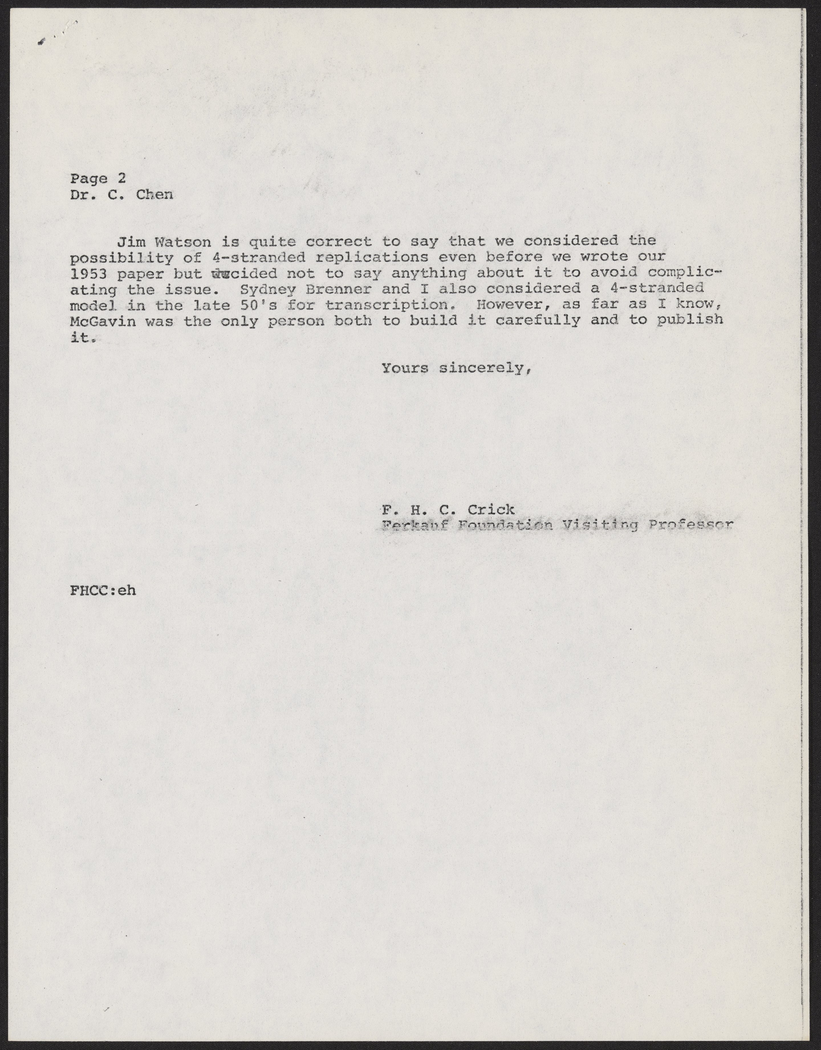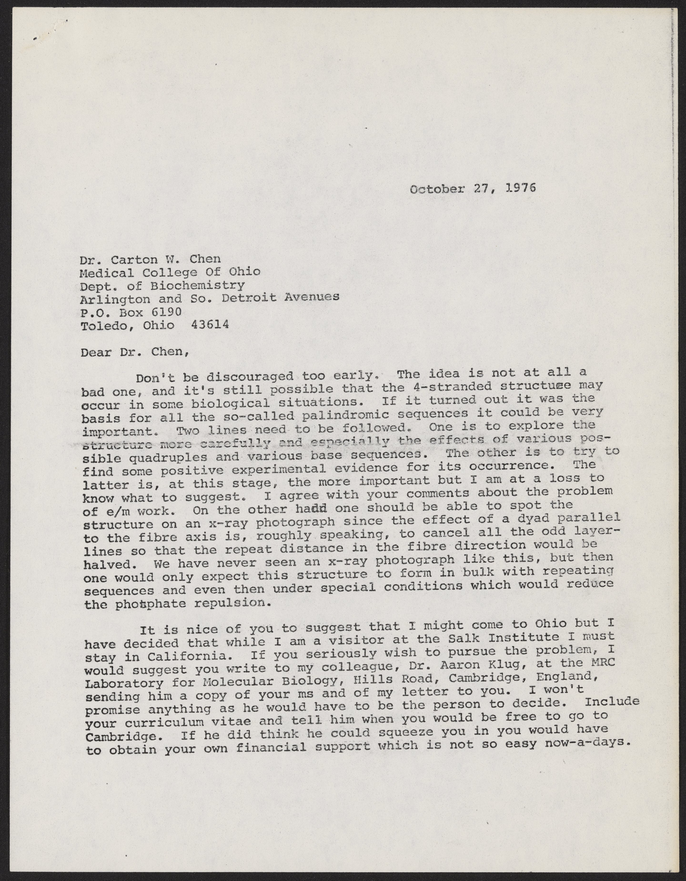 Crick, Francis. “Letter from Francis Crick to Carton W. Chen, October 27, 1976,” October 27, 1976. History of Molecular Biology Collection, Box 19, Folder 25. Science History Institute. Philadelphia. https://digital.sciencehistory.org/works/7t1bae0.
