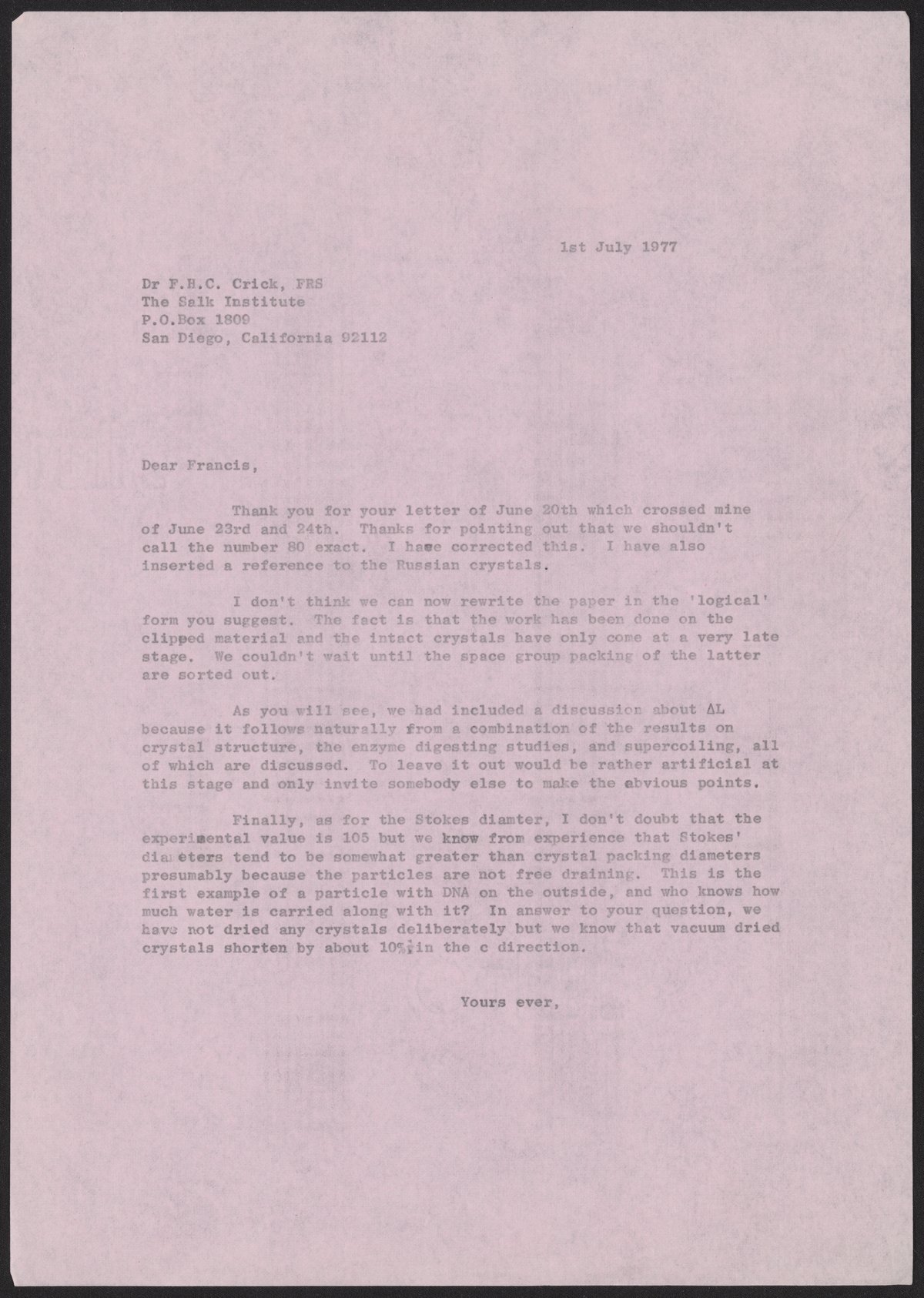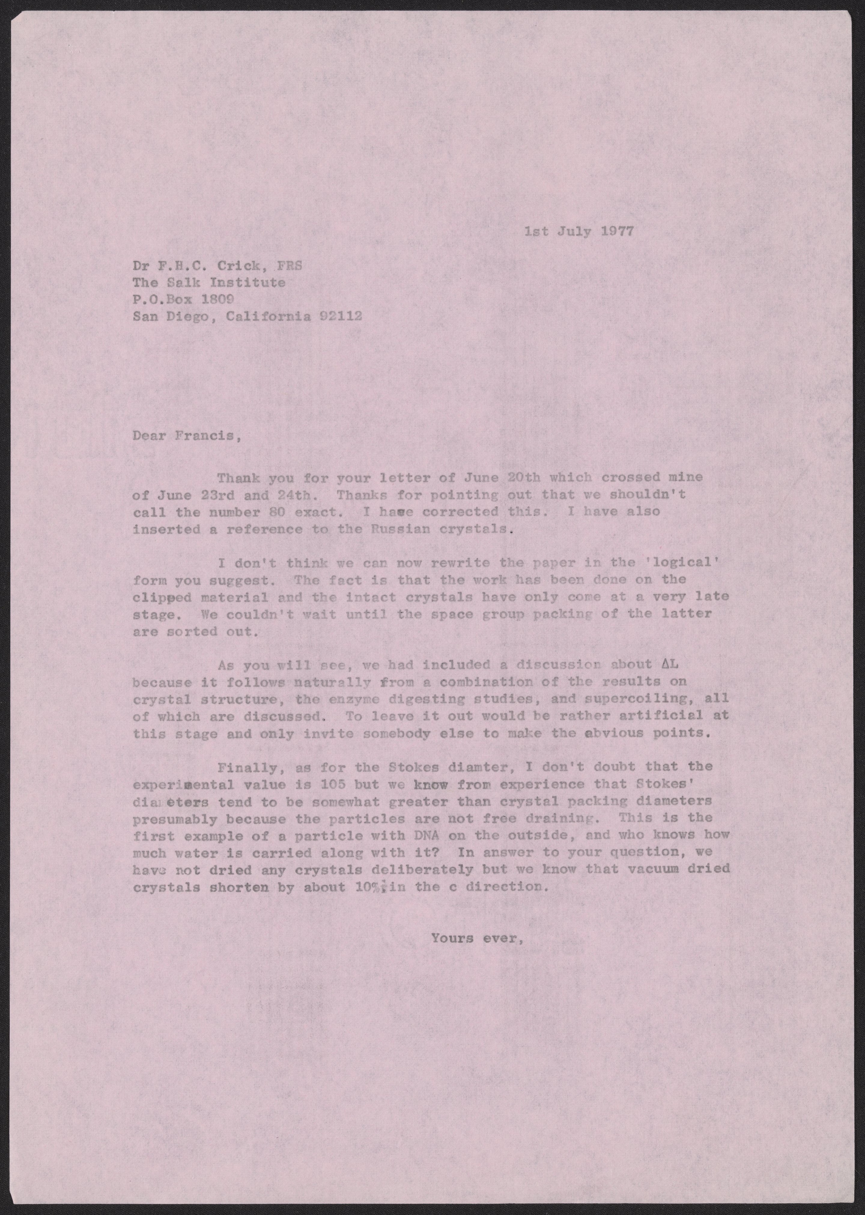 Klug, A. (Aaron), Sir. “Letter from Aaron Klug to Francis Crick, July 1, 1977,” July 1, 1977. History of Molecular Biology Collection, Box 20, Folder 1. Science History Institute. Philadelphia. https://digital.sciencehistory.org/works/7t6j9sv.