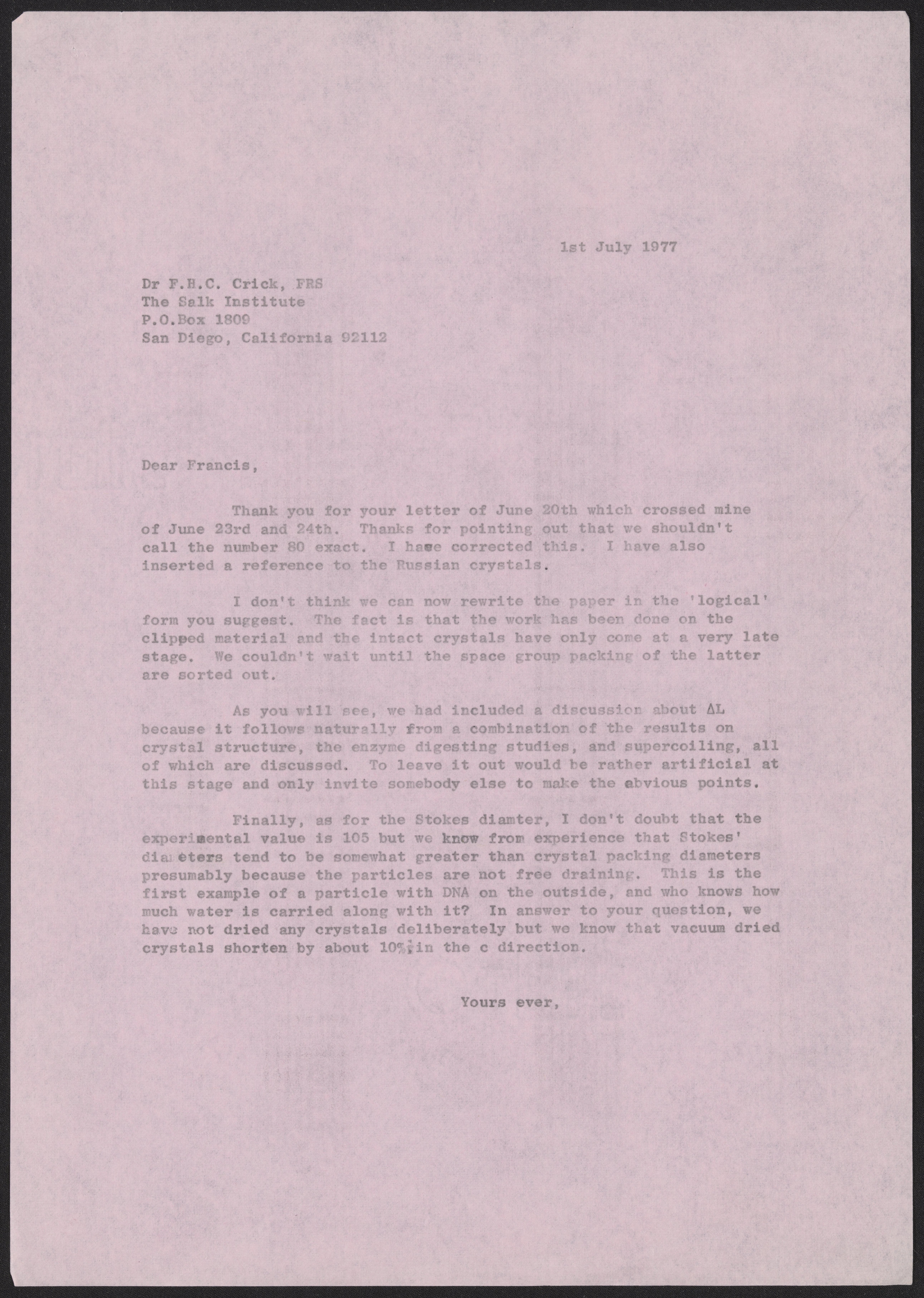 Klug, A. (Aaron), Sir. “Letter from Aaron Klug to Francis Crick, July 1, 1977,” July 1, 1977. History of Molecular Biology Collection, Box 20, Folder 1. Science History Institute. Philadelphia. https://digital.sciencehistory.org/works/7t6j9sv.