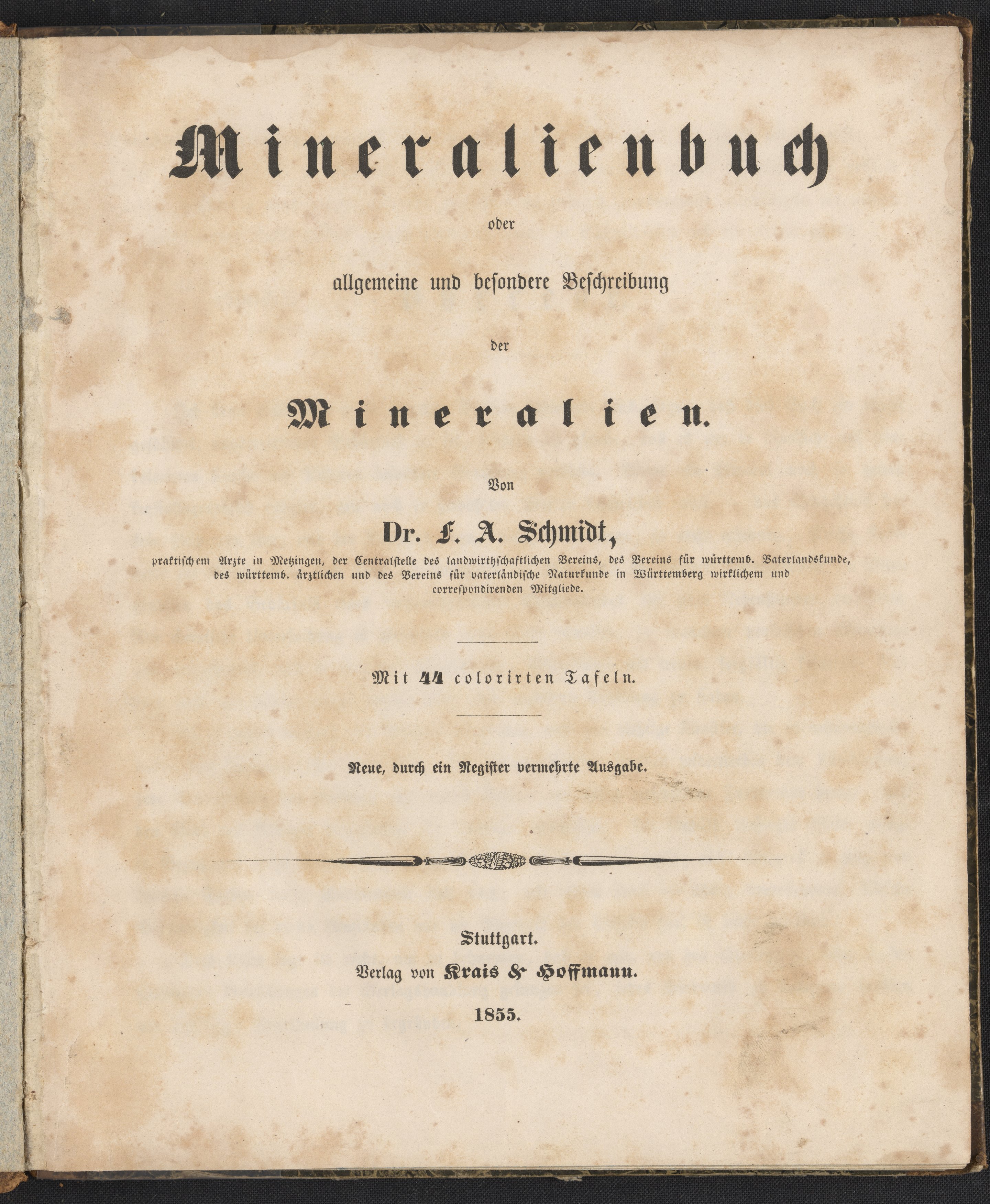 Schmidt, F.A., active 19th century. Mineralienbuch. Stuttgart, Germany: Krais & Hoffmann, 1855. https://digital.sciencehistory.org/works/7tvggnr.