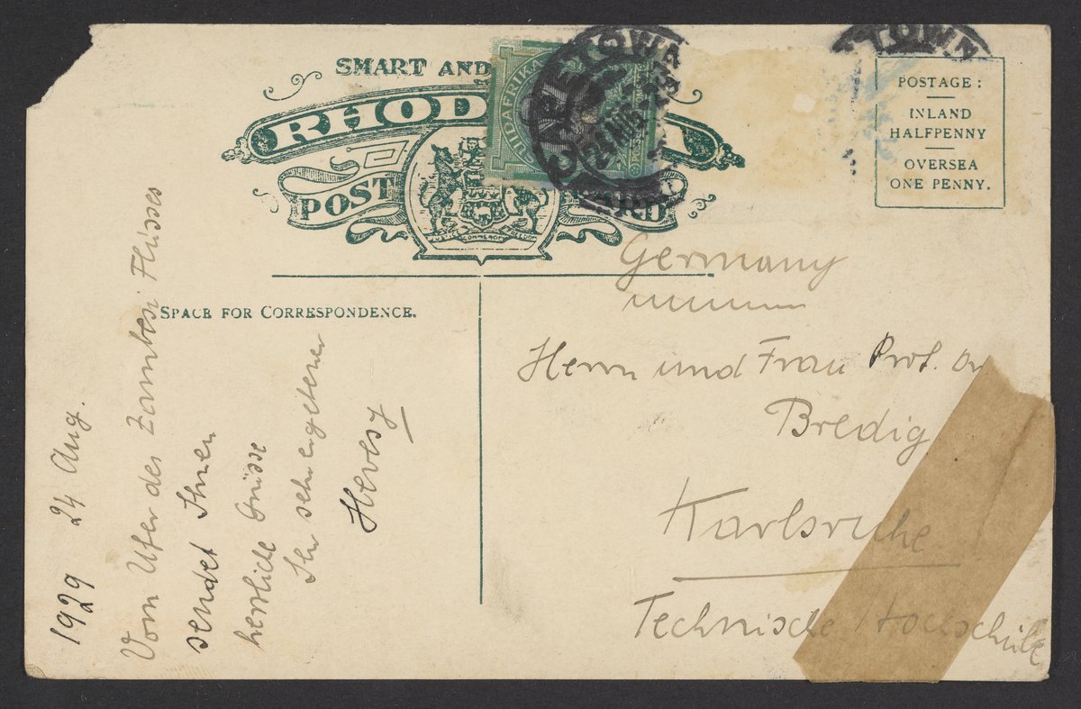 Hevesy, Georg von. “Postcard from George Hevesy to Georg Bredig,” August 24, 1929. Papers of Georg and Max Bredig, Box 1, Folder 28. Science History Institute. Philadelphia. https://digital.sciencehistory.org/works/7um74jh.