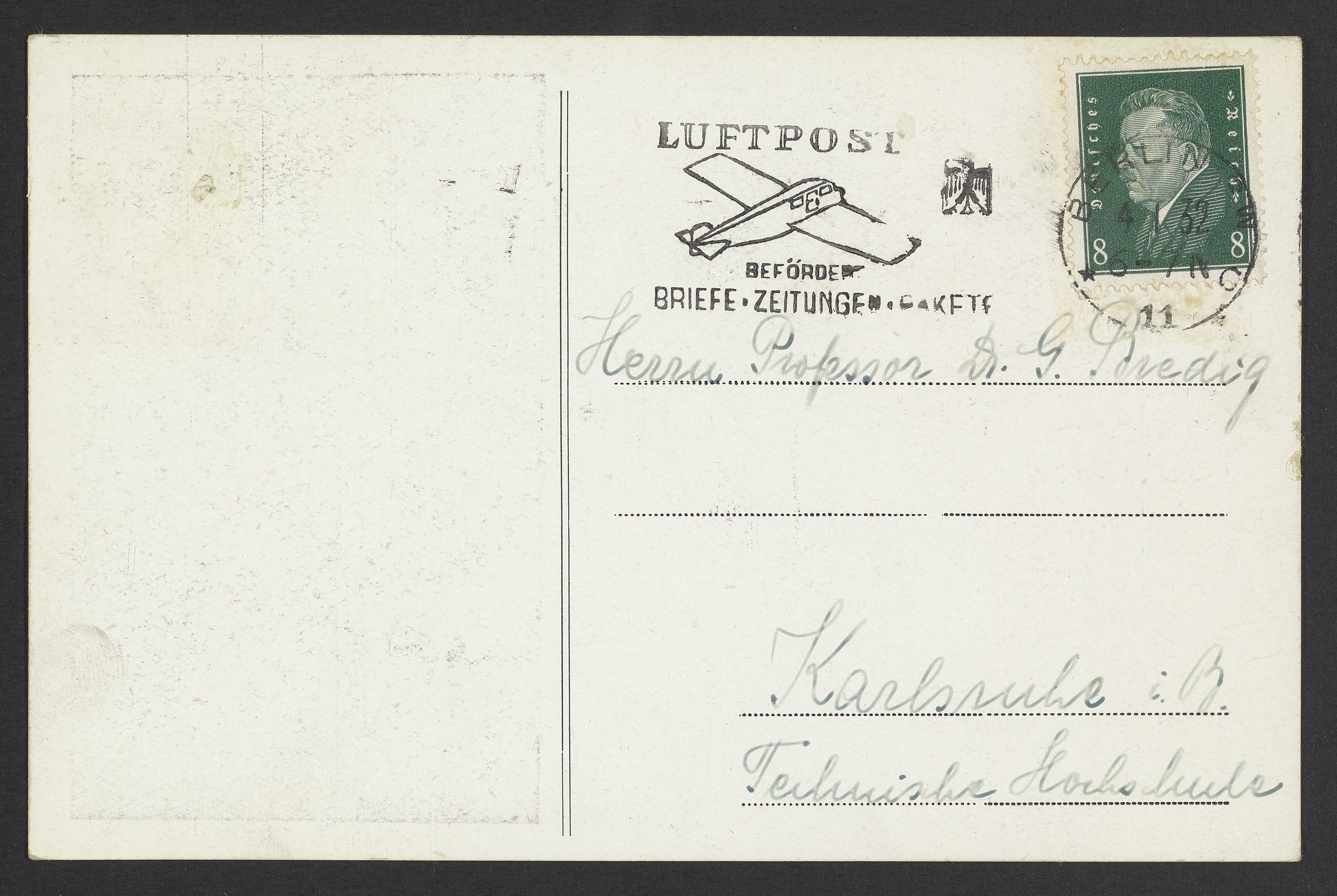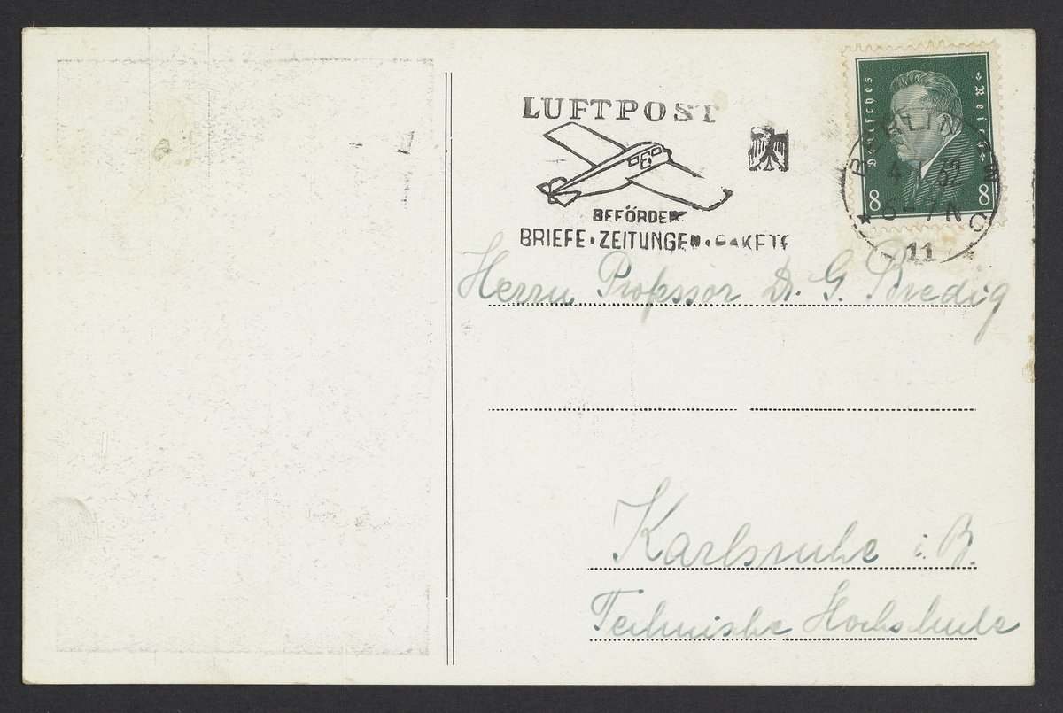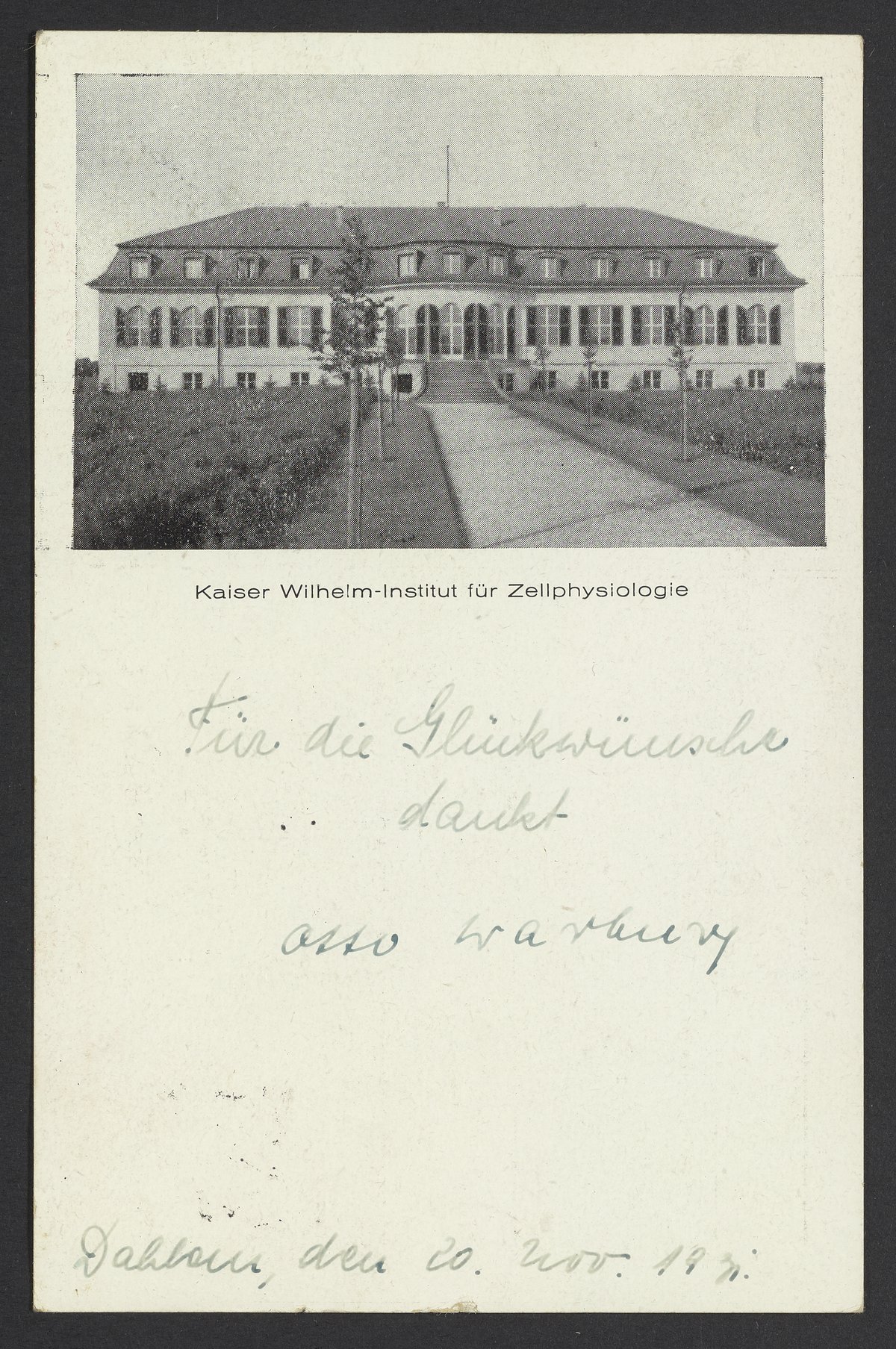 Small JPG1200 x 1807px — 495 KBFull-sized JPG2348 x 3536px — 1.8 MBOriginal fileTIFF — 2348 x 3536px — 23.8 MBPostcard sent to Georg Bredig (1868-1944) of the Kaiser Wilhelm Institute for Cell Physiology. The Institute was founded in 1930 in Dahlem, Berlin by Otto Heinrich Warburg (1883-1970) and the Rockefeller Foundation.