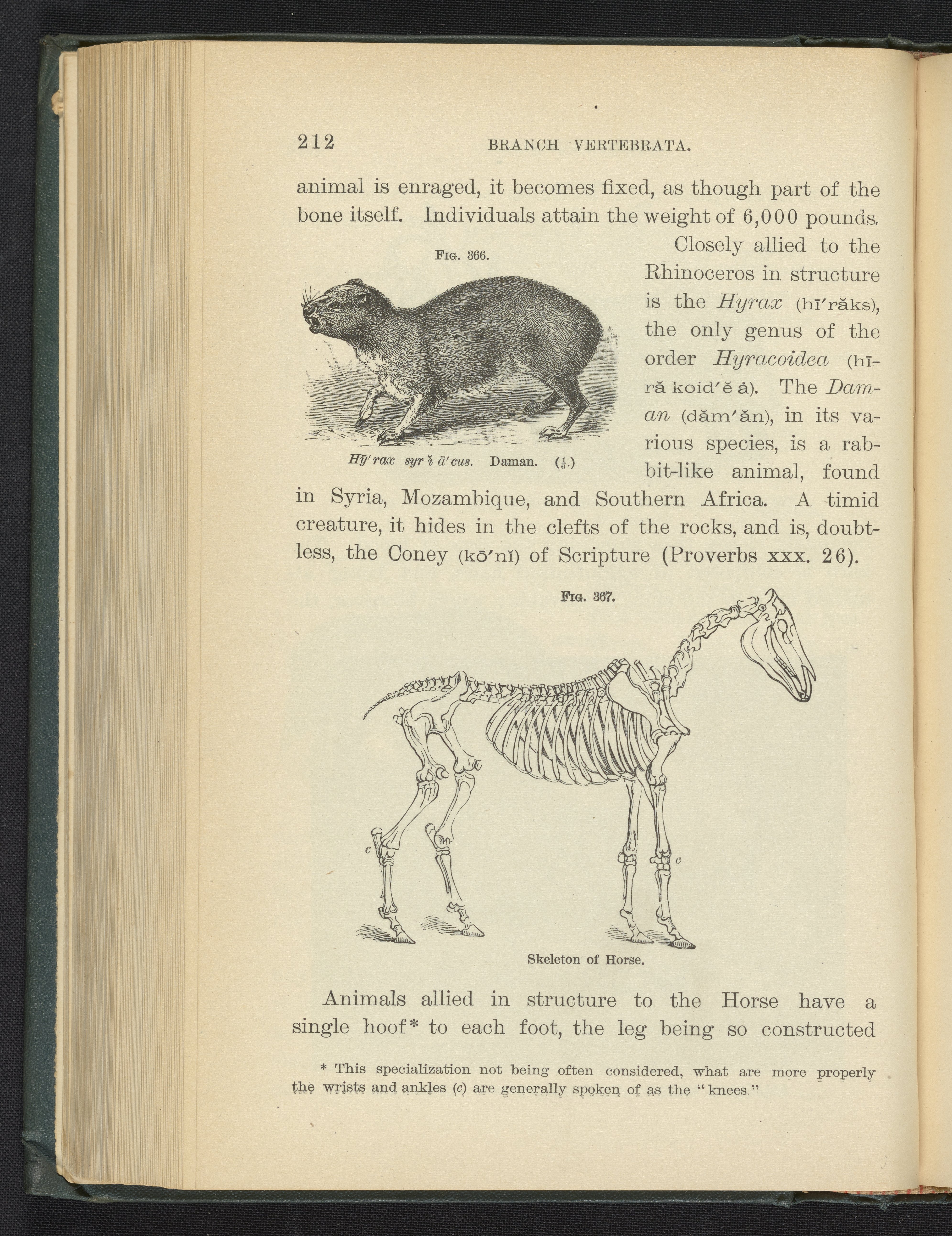 Steele, Joel Dorman, and Jenks, J. W. P. (John Whipple Potter). “Figure 366. Daman. Figure 367. Skeleton of Horse.” Popular Zoology. New York, New York: Chautauqua Press, 1887. https://digital.sciencehistory.org/works/7uyfo13.