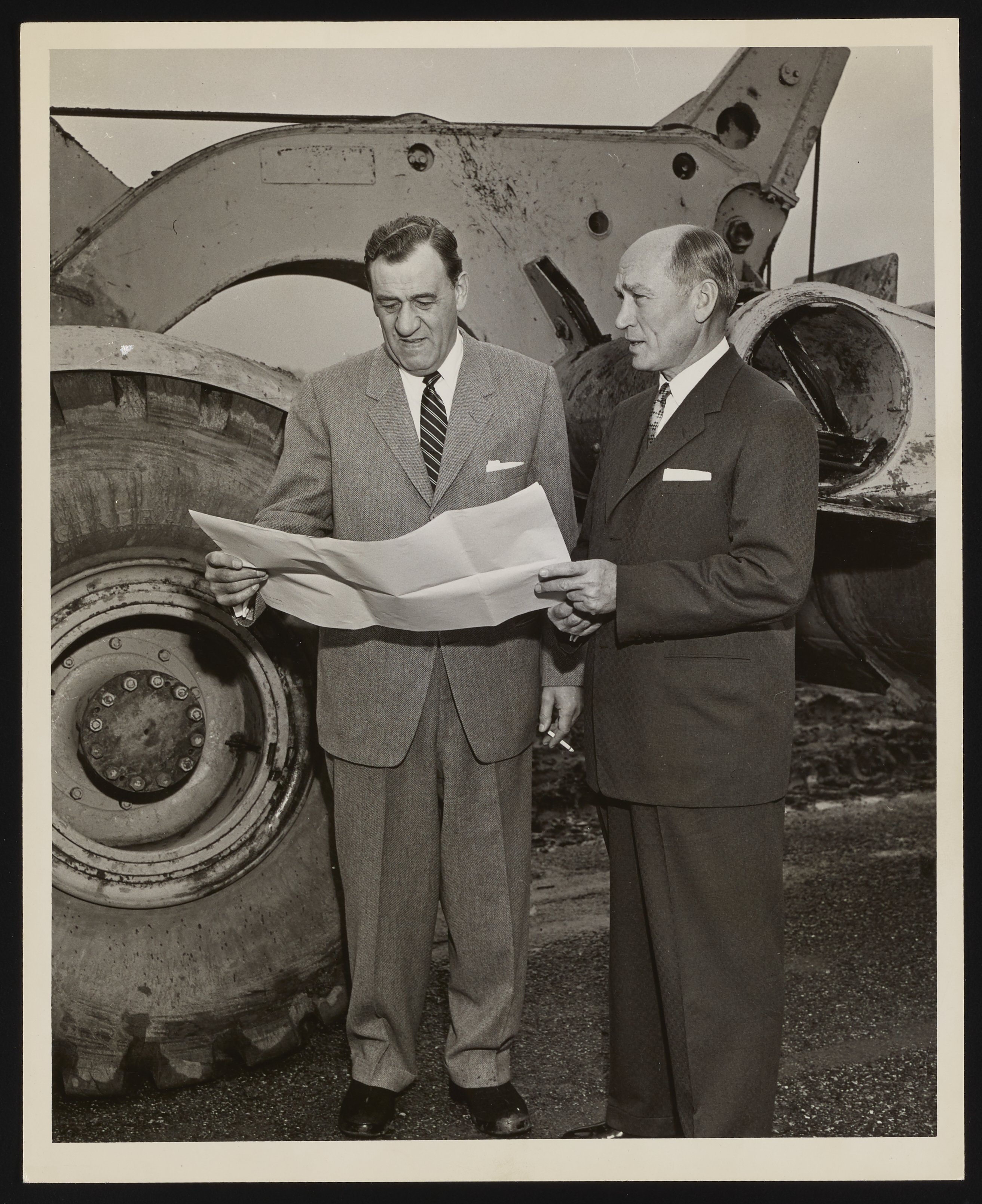 Arnold O. Beckman with unidentified man at construction site
