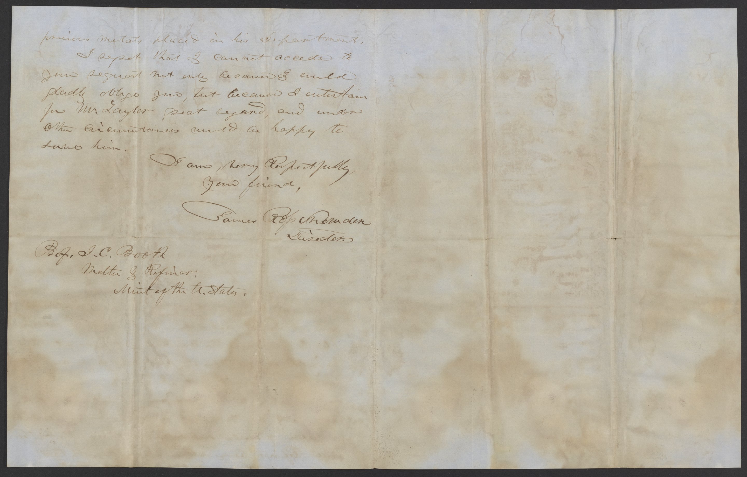 Snowden, James Ross. “Letter from J. Ross Snowden to James Curtis Booth, October 6, 1853,” October 6, 1853. Papers of James Curtis Booth, Box 1, Folder 6. Science History Institute. Philadelphia. https://digital.sciencehistory.org/works/7w7cqqs.