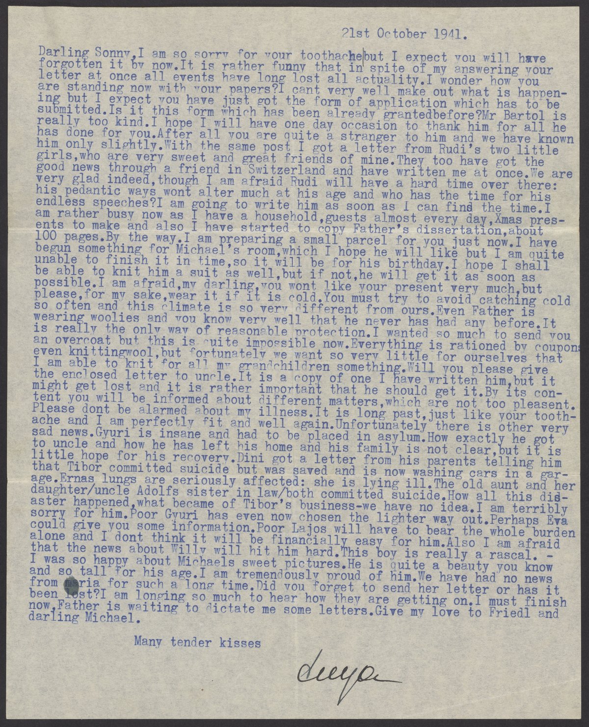 Letter to Gabor B. Levy (1913-1999) from his mother Margaret Levy (1886-1975), who signs as "Suya."