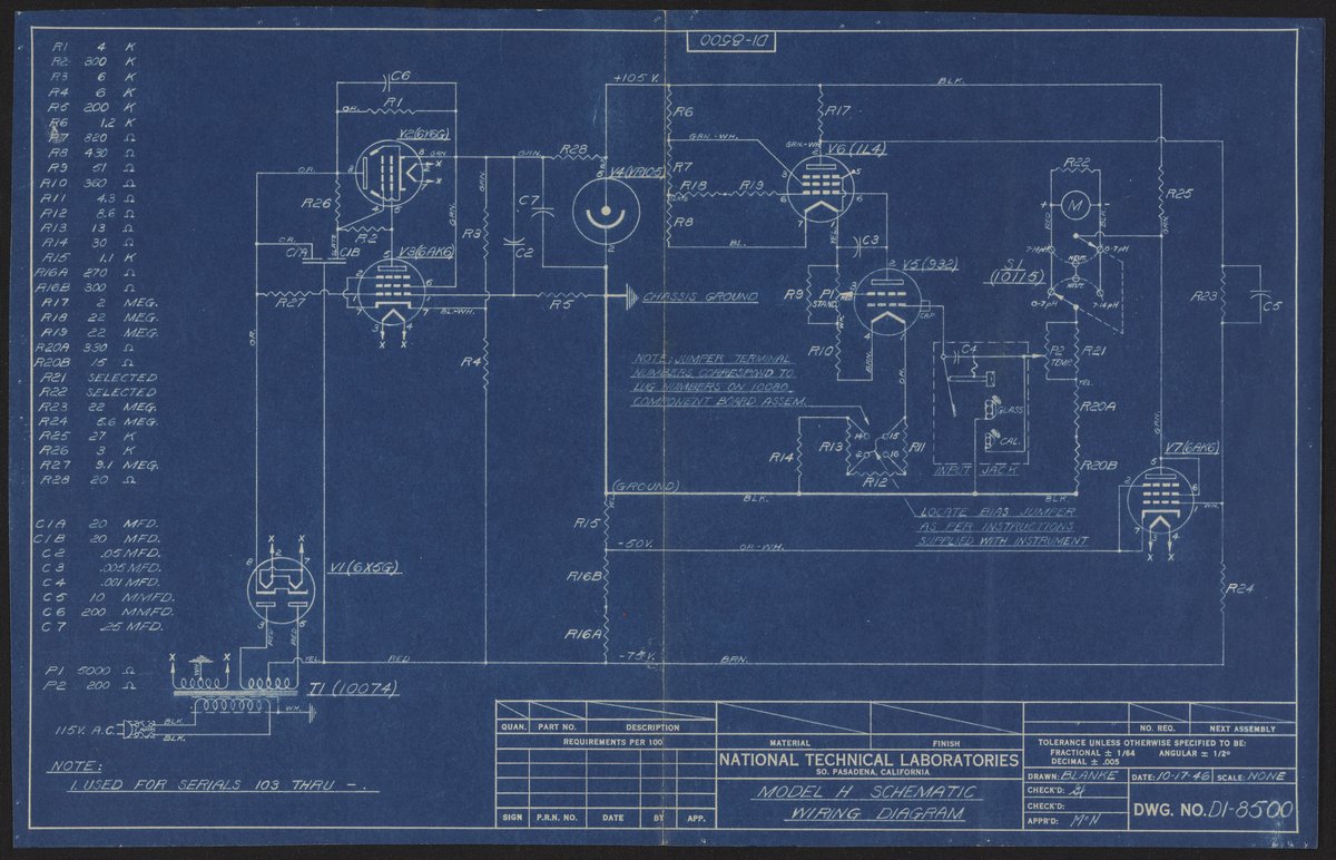 Beckman Instruments, Inc. “Beckman Model H PH Meter Schematic Wiring Diagram,” October 17, 1946. Beckman Historical Collection, Box 18, Folder 24. Science History Institute. Philadelphia. https://digital.sciencehistory.org/works/8049g5061.
