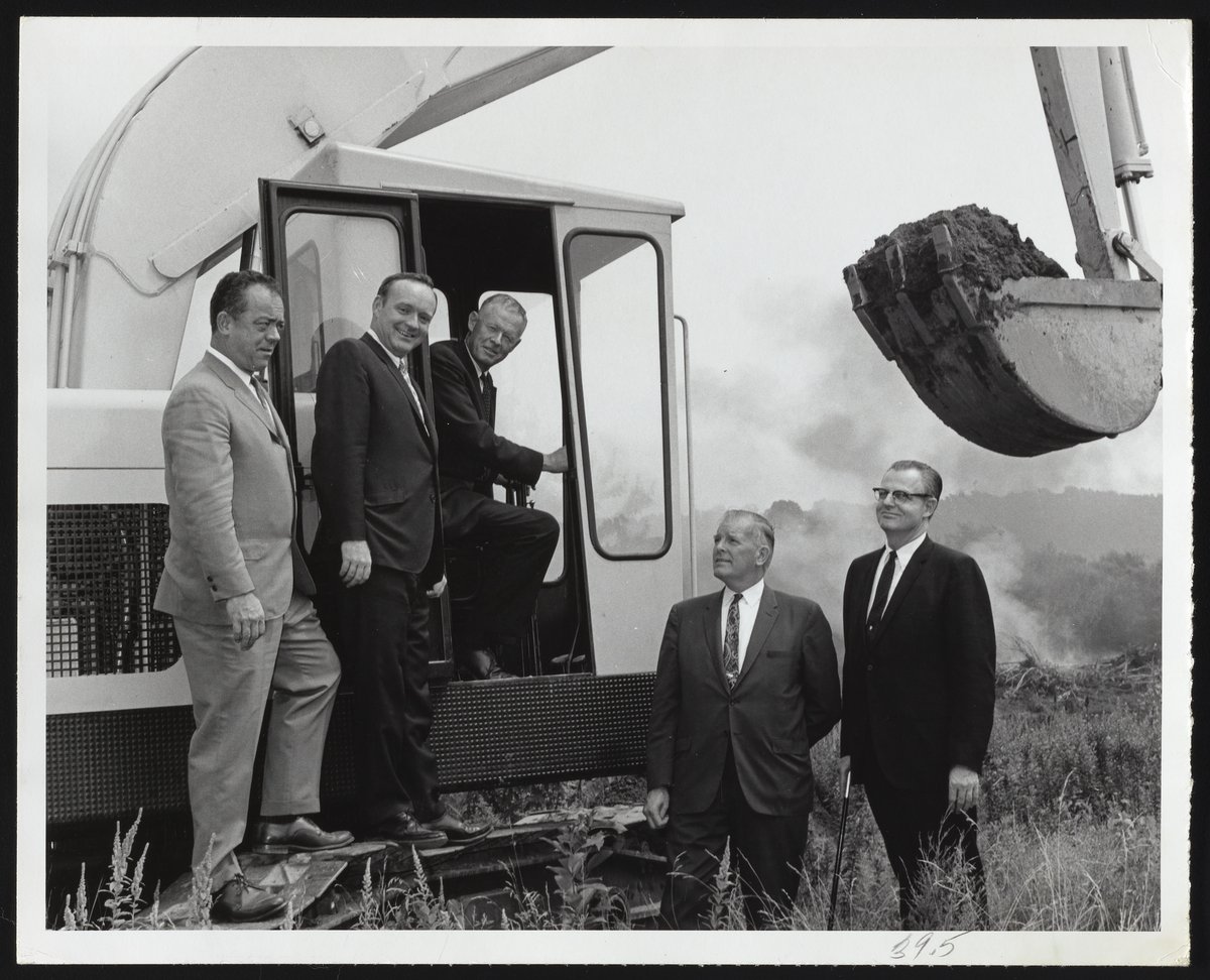 General view of the groundbreaking ceremony for a new Perkin-Elmer Corporation facility in Meriden, Connecticut. Perkin-Elmer President Chester W. Nimitz, Jr. is seen seated at the controls of the machine at the center of the photograph. The other individuals present in the photograph are identified as follows (left to right): Carter H. White (Vice President, Meriden Industrial Development Commission); Meriden Mayor William T. Shea; George D. Huff (Perkin-Elmer official); and Otis C. Ferrell (Perkin-Elmer official).