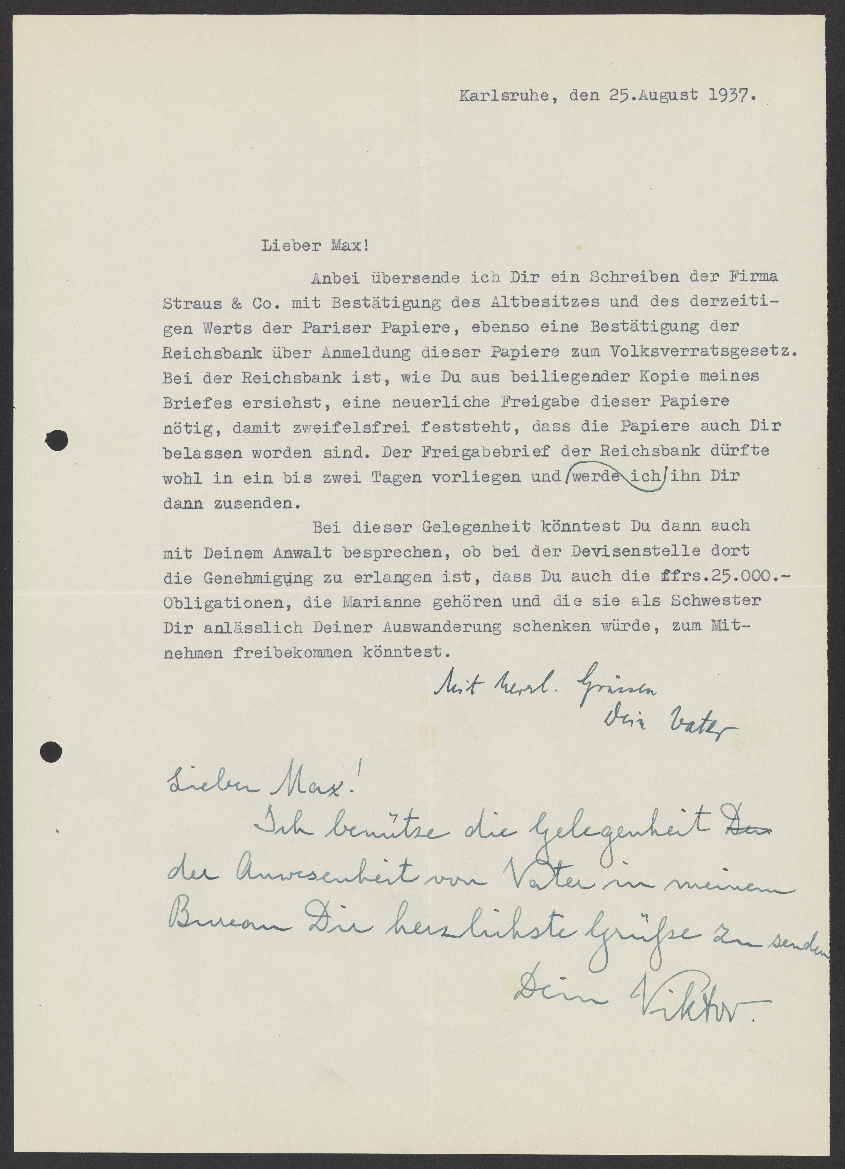Anbei übersende ich Dir ein Schreiben der Firma Straus & Co. mit Bestätigung des Altbesitzes und des derzeitigen Werts der Pariser Papiere, ebenso eine Bestätigung der Reichsbank über Anmeldung dieser Papiere zum Volksverratsgesetz. Bei der Reichsbank ist, wie Du aus beiliegender Kopie meines Briefes ersiehst, eine neuerliche Freigabe dieser Papiere nötig, damit zweifelsfrei feststeht, dass die Papiere auch Dir belassen worden sind. Der Freigabebrief der Reichsbank dürfte wohl in ein bis zwei Tagen vorliegen und werde ich ihn Dir dann zusenden.