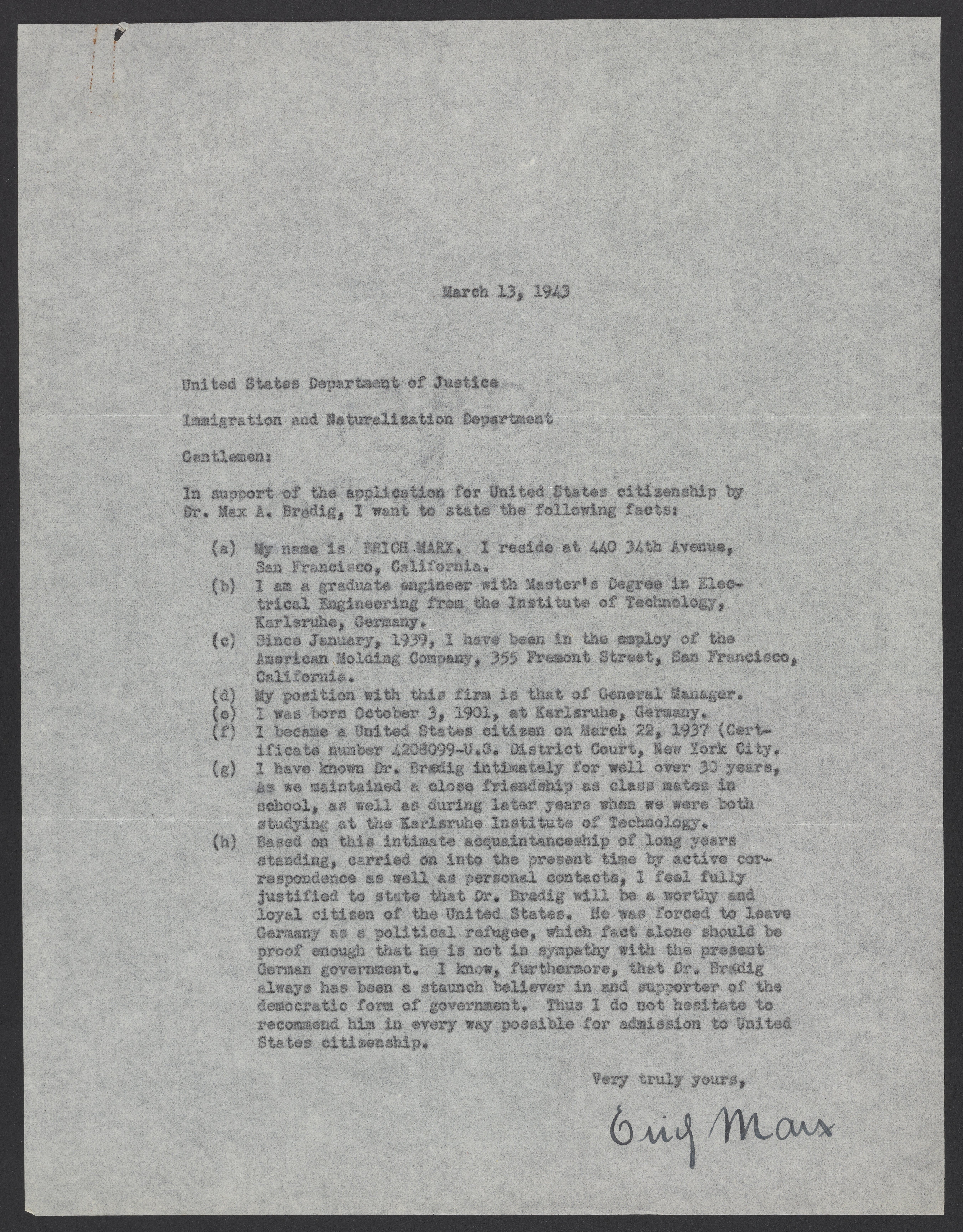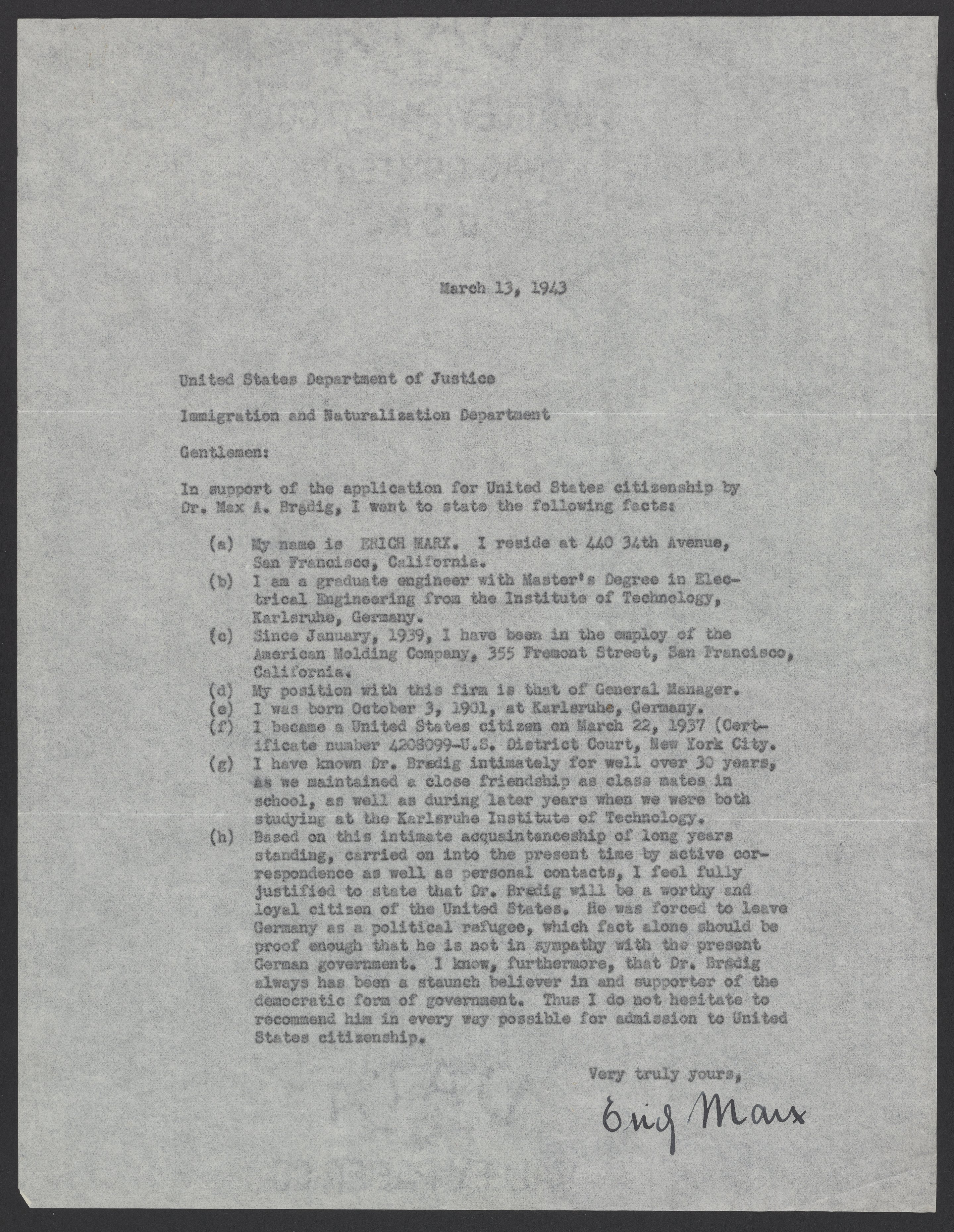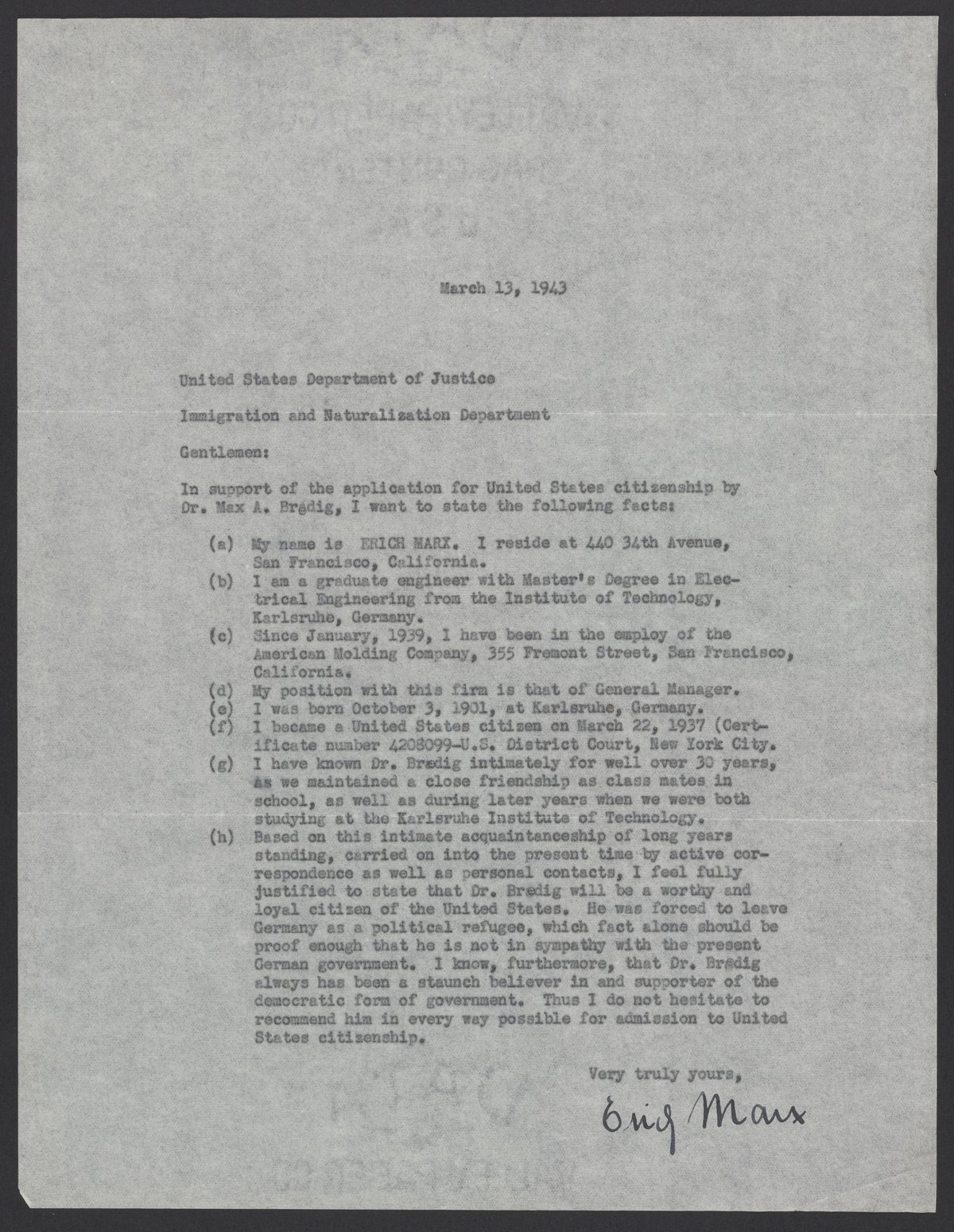 Small JPG1200 x 1549px — 361 KBLarge JPG2880 x 3718px — 2.4 MBFull-sized JPG5372 x 6936px — 7.7 MBOriginal fileTIFF — 5372 x 6936px — 107 MBTestimony from Erich Marx (1901-1990) for Max Albert Bredig's (1902-1977) petition for naturalization.